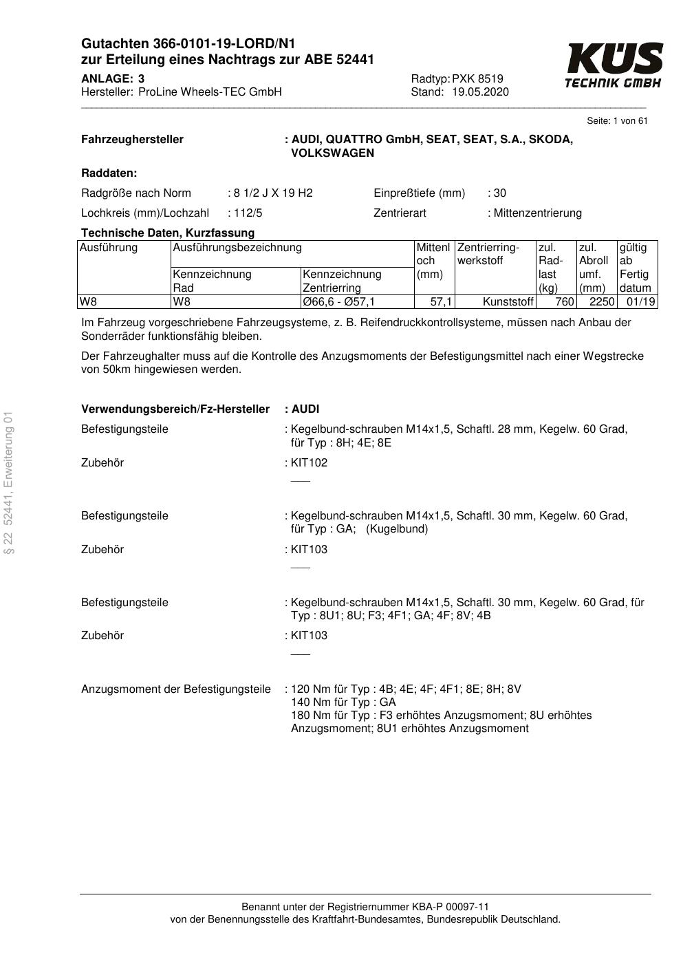 Felgengutachten / ABE für Alufelgen Proline PXK (8.5Jx19 ET 0, Mittenloch 0 mm) mit KBA 52441 (Zertifikatsnummer KBA 52441). Hier kostenlos als PDF herunterladen. Der Download-Link ist 24 Stunden gültig und kann bis zu zwei Mal verwendet werden.