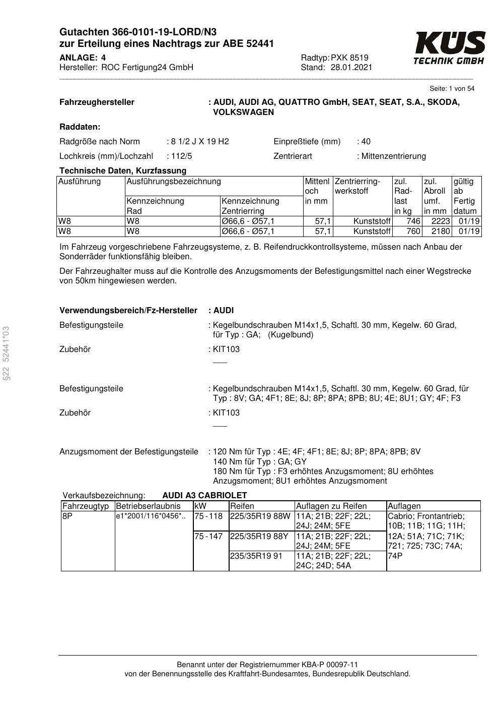 Felgengutachten / ABE für Alufelgen Proline PXK (8.5Jx19 ET 0, Mittenloch 0 mm) mit KBA 52441 (Zertifikatsnummer KBA 52441). Hier kostenlos als PDF herunterladen. Der Download-Link ist 24 Stunden gültig und kann bis zu zwei Mal verwendet werden.