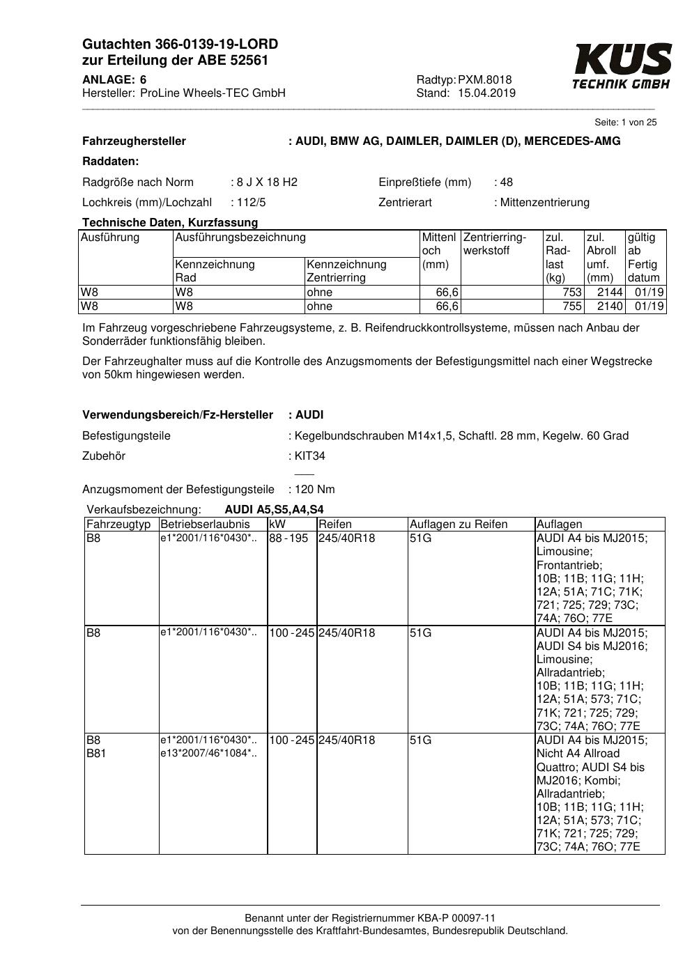 Felgengutachten / ABE für Alufelgen Proline PXM.8018 (8Jx18 ET 0, Mittenloch 0 mm) mit KBA 52561 (Zertifikatsnummer KBA 52561). Hier kostenlos als PDF herunterladen. Der Download-Link ist 24 Stunden gültig und kann bis zu zwei Mal verwendet werden.
