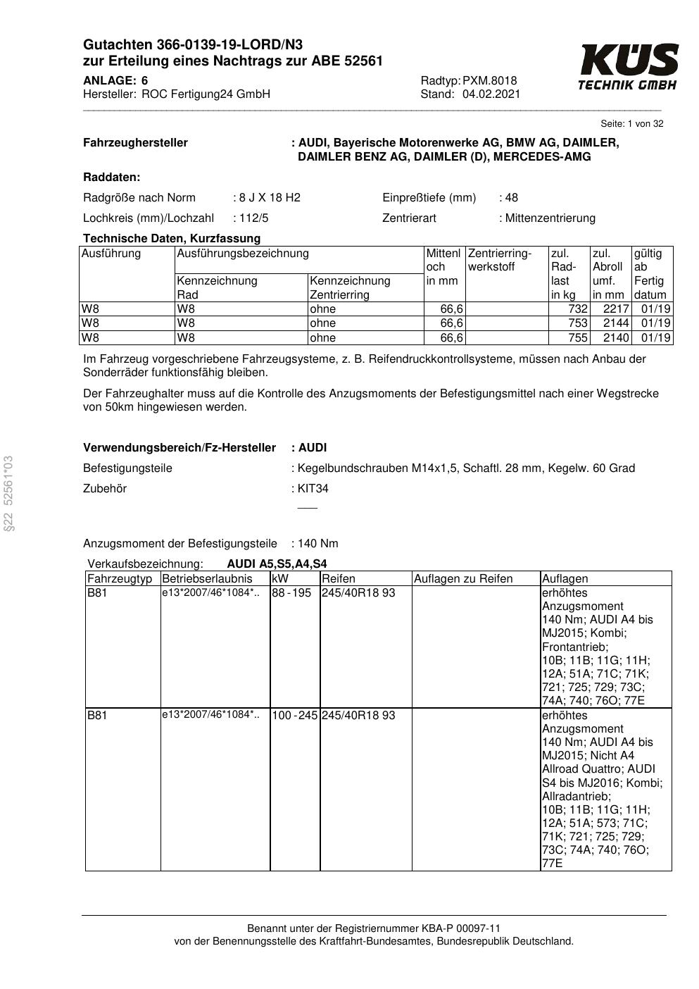 Felgengutachten / ABE für Alufelgen Proline PXM.8018 (8Jx18 ET 0, Mittenloch 0 mm) mit KBA 52561 (Zertifikatsnummer KBA 52561). Hier kostenlos als PDF herunterladen. Der Download-Link ist 24 Stunden gültig und kann bis zu zwei Mal verwendet werden.
