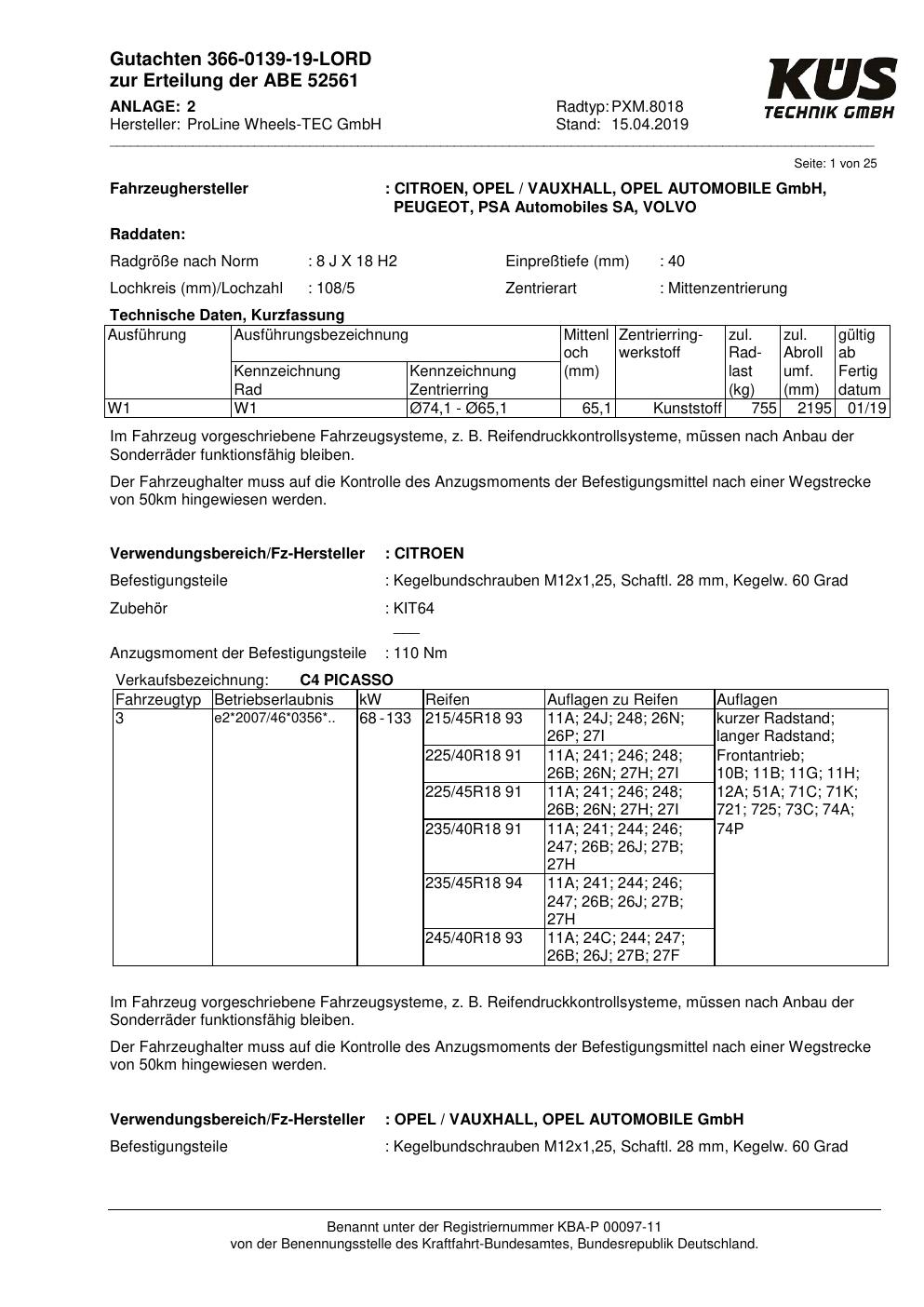 Felgengutachten / ABE für Alufelgen Proline PXM.8018 (8Jx18 ET 0, Mittenloch 0 mm) mit KBA 52561 (Zertifikatsnummer KBA 52561). Hier kostenlos als PDF herunterladen. Der Download-Link ist 24 Stunden gültig und kann bis zu zwei Mal verwendet werden.