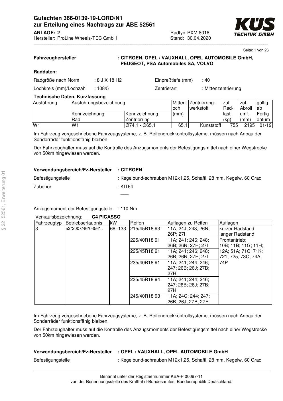 Felgengutachten / ABE für Alufelgen Proline PXM.8018 (8Jx18 ET 0, Mittenloch 0 mm) mit KBA 52561 (Zertifikatsnummer KBA 52561). Hier kostenlos als PDF herunterladen. Der Download-Link ist 24 Stunden gültig und kann bis zu zwei Mal verwendet werden.
