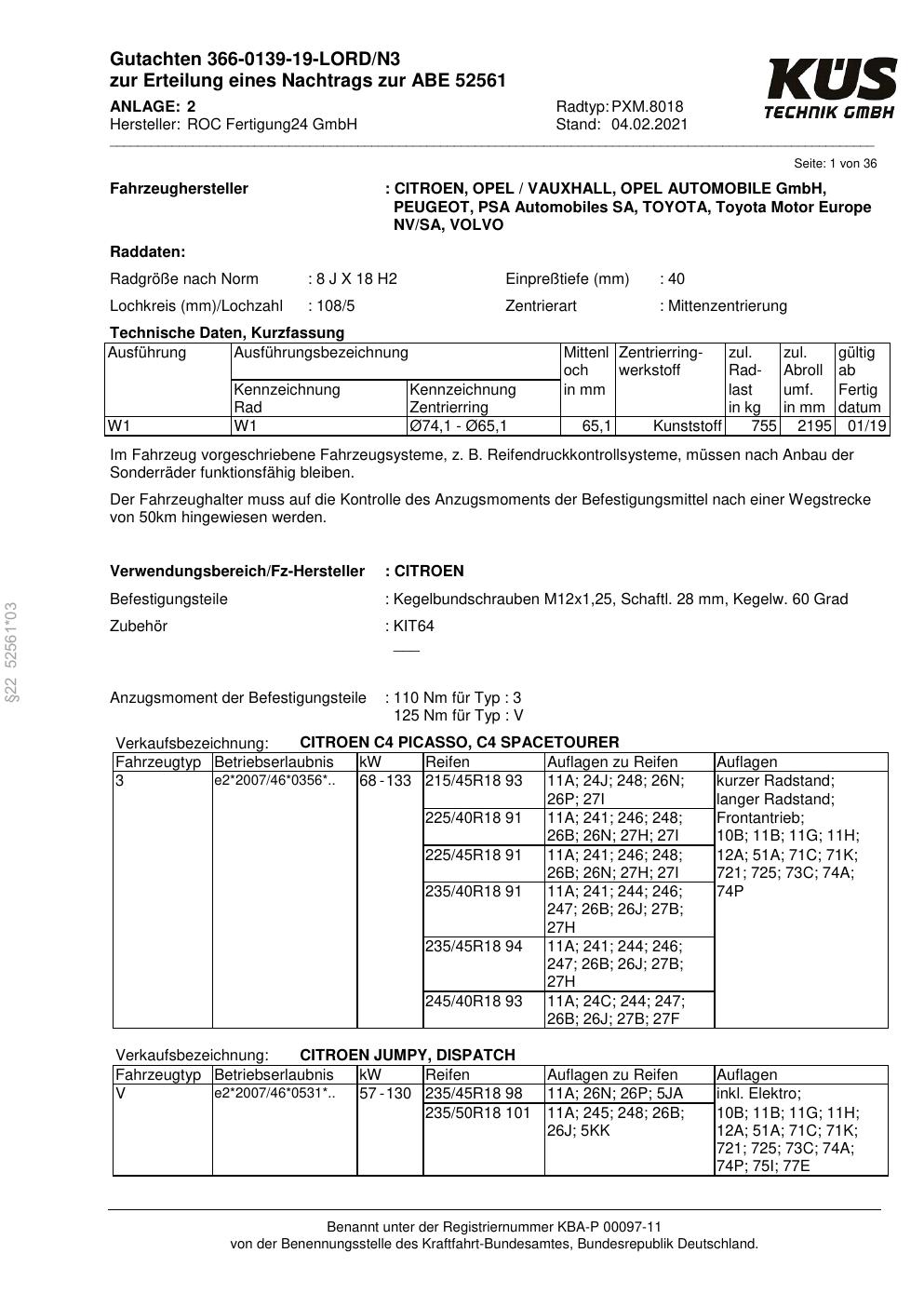 Dieses Gutachten (ABE) bezieht sich auf die Alufelge Proline PXM.8018 in der Ausführung 8Jx18 ET 0, Mittenloch 0 mm (KBA 52561). Im PDF findest du typischerweise zulässige Reifengrößen, Auflagen/Anbauhinweise und – je nach Dokument – Hinweise zur Eintragung.