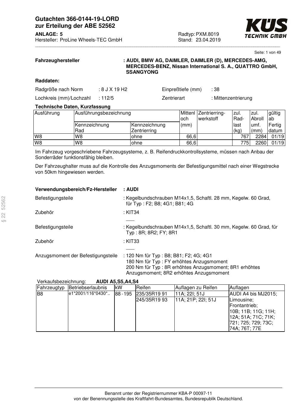Felgengutachten / ABE für Alufelgen Proline PXM.8019 (8Jx19 ET 0, Mittenloch 0 mm) mit KBA 52562 (Zertifikatsnummer KBA 52562). Hier kostenlos als PDF herunterladen. Der Download-Link ist 24 Stunden gültig und kann bis zu zwei Mal verwendet werden.
