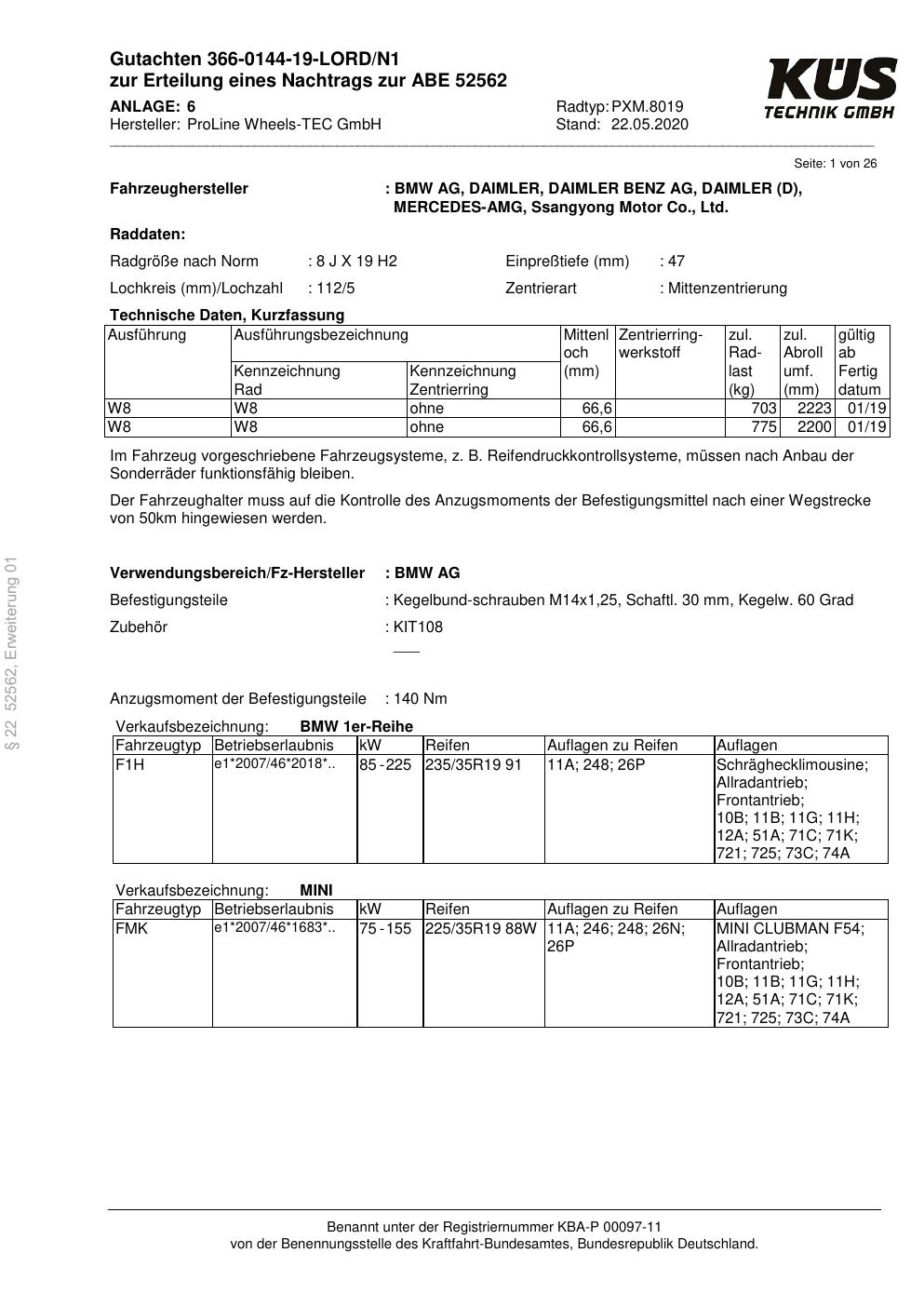 Felgengutachten / ABE für Alufelgen Proline PXM.8019 (8Jx19 ET 0, Mittenloch 0 mm) mit KBA 52562 (Zertifikatsnummer KBA 52562). Hier kostenlos als PDF herunterladen. Der Download-Link ist 24 Stunden gültig und kann bis zu zwei Mal verwendet werden.