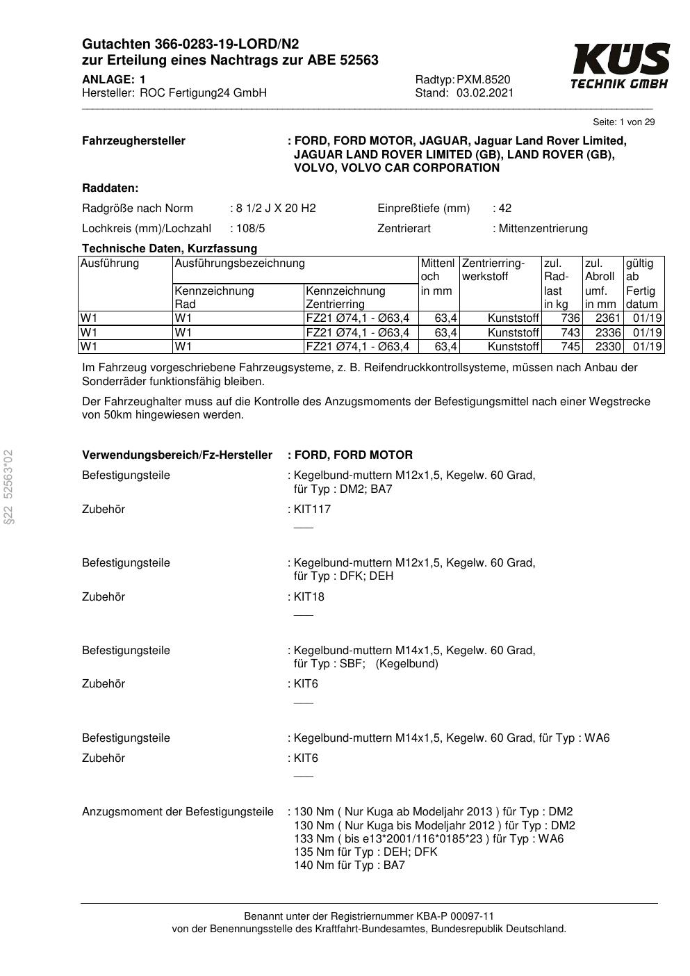 Felgengutachten / ABE für Alufelgen Proline PXM.8520 (8.5Jx2 ET 0, Mittenloch 0 mm) mit KBA 52563 (Zertifikatsnummer KBA 52563). Hier kostenlos als PDF herunterladen. Der Download-Link ist 24 Stunden gültig und kann bis zu zwei Mal verwendet werden.