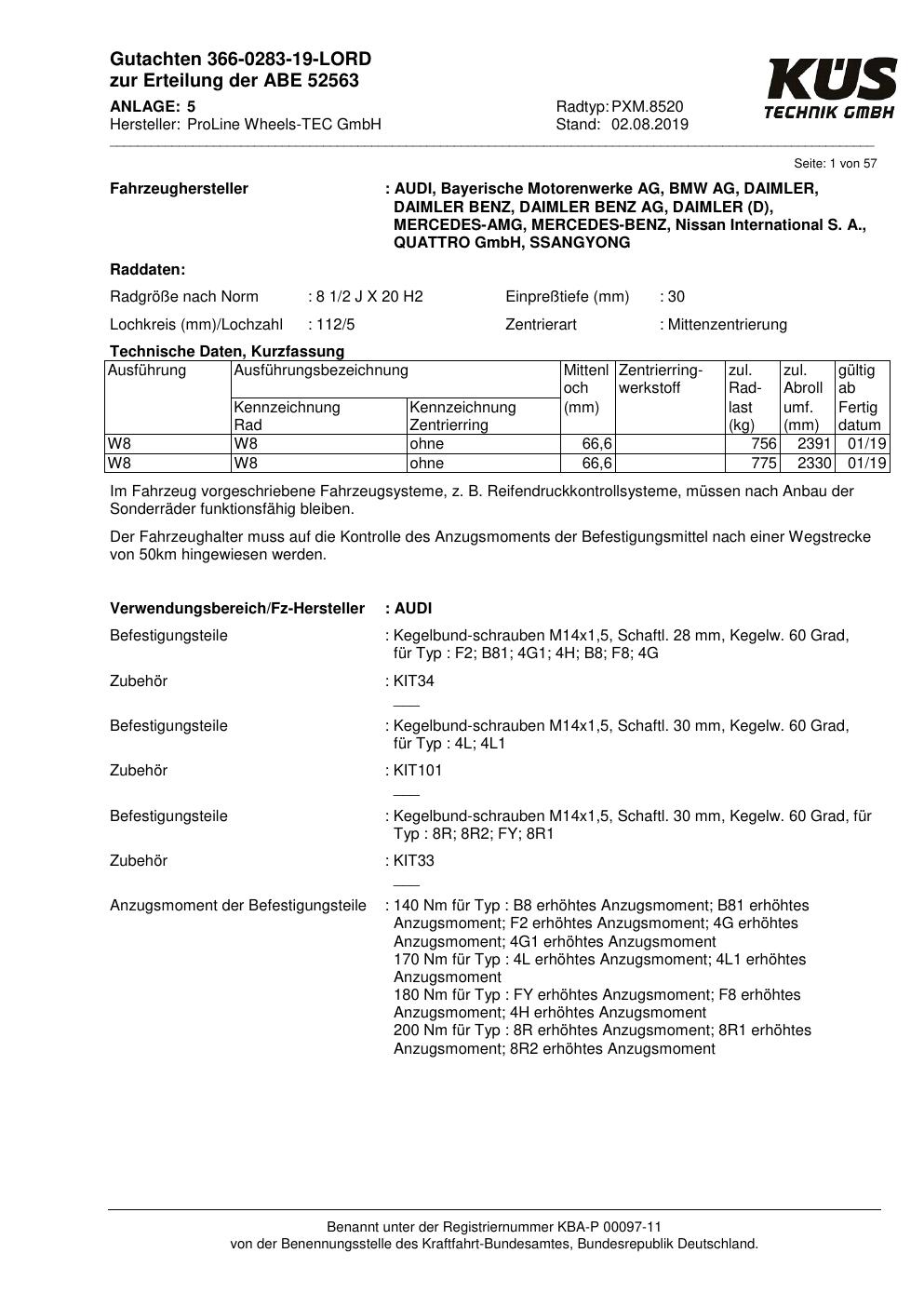 Felgengutachten / ABE für Alufelgen Proline PXM.8520 (8.5Jx2 ET 0, Mittenloch 0 mm) mit KBA 52563 (Zertifikatsnummer KBA 52563). Hier kostenlos als PDF herunterladen. Der Download-Link ist 24 Stunden gültig und kann bis zu zwei Mal verwendet werden.
