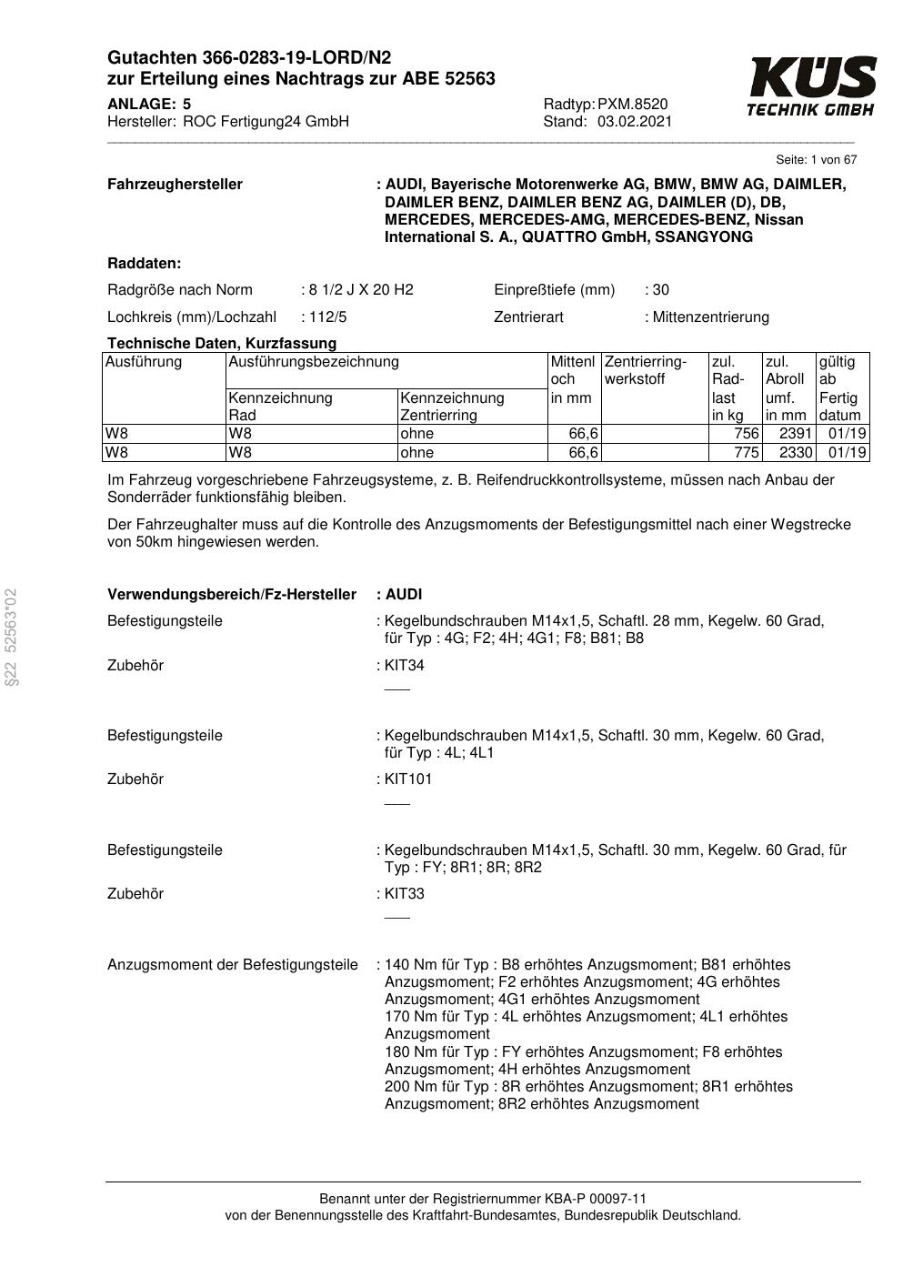 Felgengutachten / ABE für Alufelgen Proline PXM.8520 (8.5Jx2 ET 0, Mittenloch 0 mm) mit KBA 52563 (Zertifikatsnummer KBA 52563). Hier kostenlos als PDF herunterladen. Der Download-Link ist 24 Stunden gültig und kann bis zu zwei Mal verwendet werden.