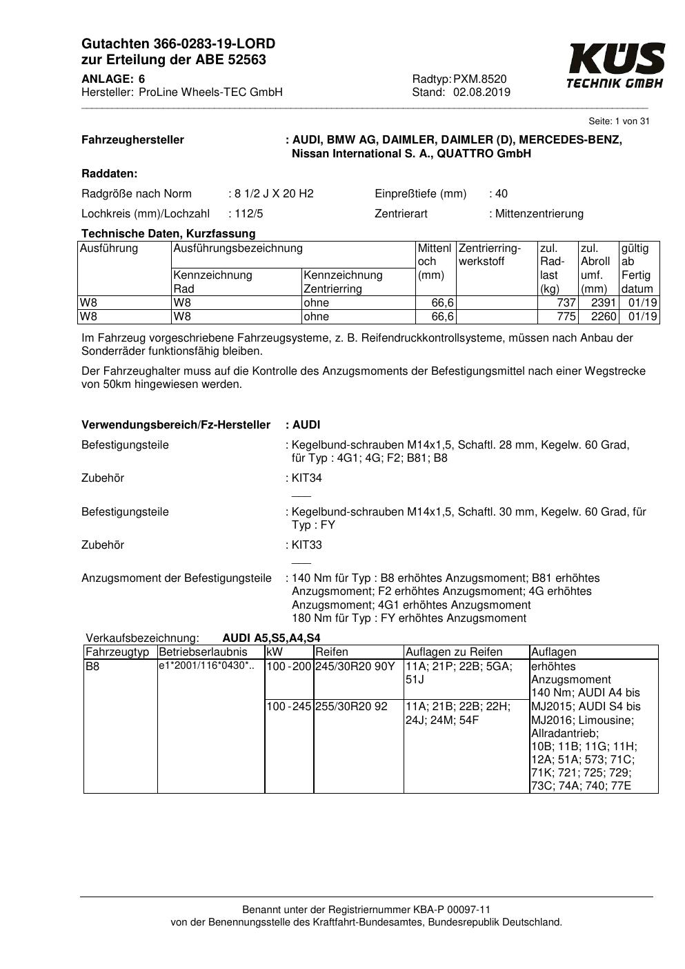 Felgengutachten / ABE für Alufelgen Proline PXM.8520 (8.5Jx2 ET 0, Mittenloch 0 mm) mit KBA 52563 (Zertifikatsnummer KBA 52563). Hier kostenlos als PDF herunterladen. Der Download-Link ist 24 Stunden gültig und kann bis zu zwei Mal verwendet werden.