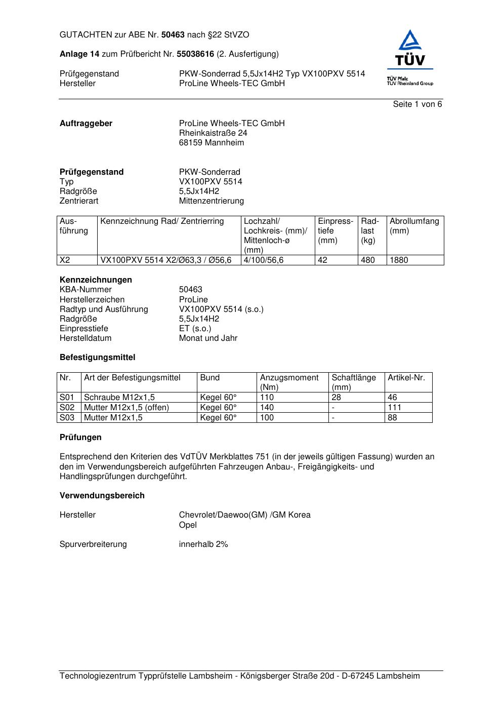 Dieses Gutachten (ABE) bezieht sich auf die Alufelge Proline PXV.5514 in der Ausführung 5.5Jx14 ET 0, Mittenloch 0 mm (KBA 50463). Im PDF findest du typischerweise zulässige Reifengrößen, Auflagen/Anbauhinweise und – je nach Dokument – Hinweise zur Eintragung.
