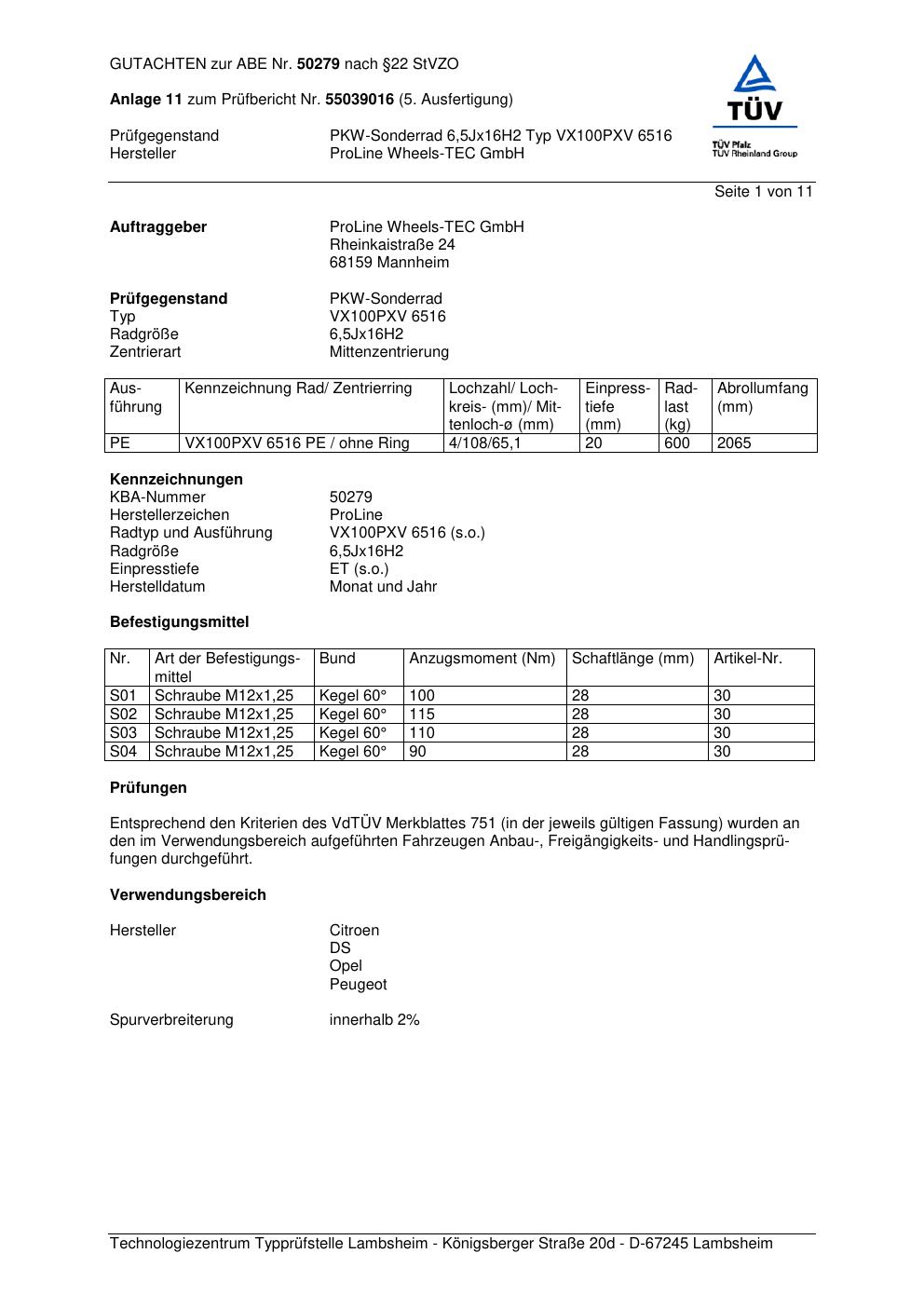 Dieses Gutachten (ABE) bezieht sich auf die Alufelge Proline PXV in der Ausführung 6.5Jx16 ET 0, Mittenloch 0 mm (KBA 50279). Im PDF findest du typischerweise zulässige Reifengrößen, Auflagen/Anbauhinweise und – je nach Dokument – Hinweise zur Eintragung.