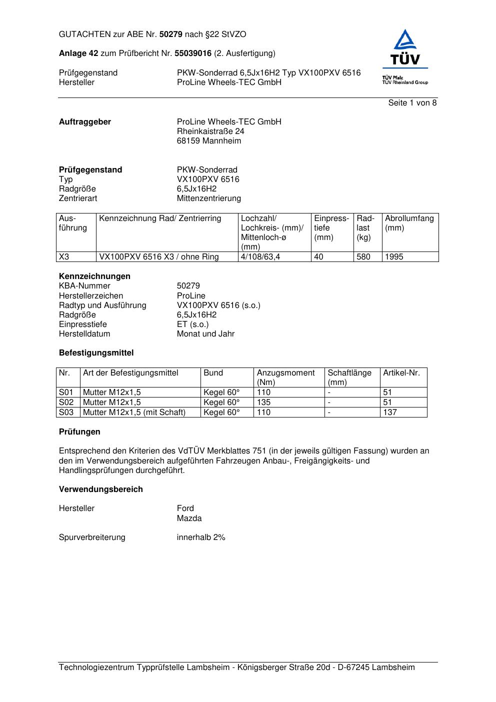 Felgengutachten / ABE für Alufelgen Proline PXV (6.5Jx16 ET 0, Mittenloch 0 mm) mit KBA 50279 (Zertifikatsnummer KBA 50279). Hier kostenlos als PDF herunterladen. Der Download-Link ist 24 Stunden gültig und kann bis zu zwei Mal verwendet werden.