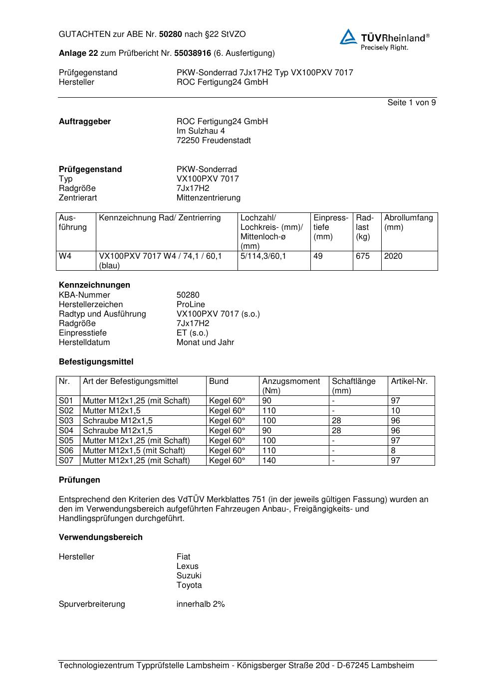 Dieses Gutachten (ABE) bezieht sich auf die Alufelge Proline PXV in der Ausführung 7Jx17 ET 0, Mittenloch 0 mm (KBA 50280). Im PDF findest du typischerweise zulässige Reifengrößen, Auflagen/Anbauhinweise und – je nach Dokument – Hinweise zur Eintragung.