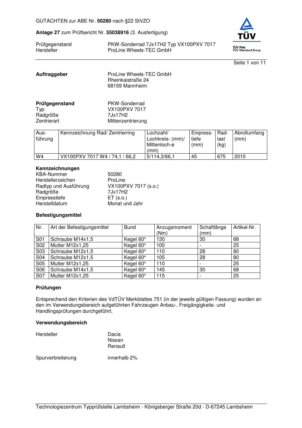 Dieses Gutachten (ABE) bezieht sich auf die Alufelge Proline PXV in der Ausführung 7Jx17 ET 0, Mittenloch 0 mm (KBA 50280). Im PDF findest du typischerweise zulässige Reifengrößen, Auflagen/Anbauhinweise und – je nach Dokument – Hinweise zur Eintragung.