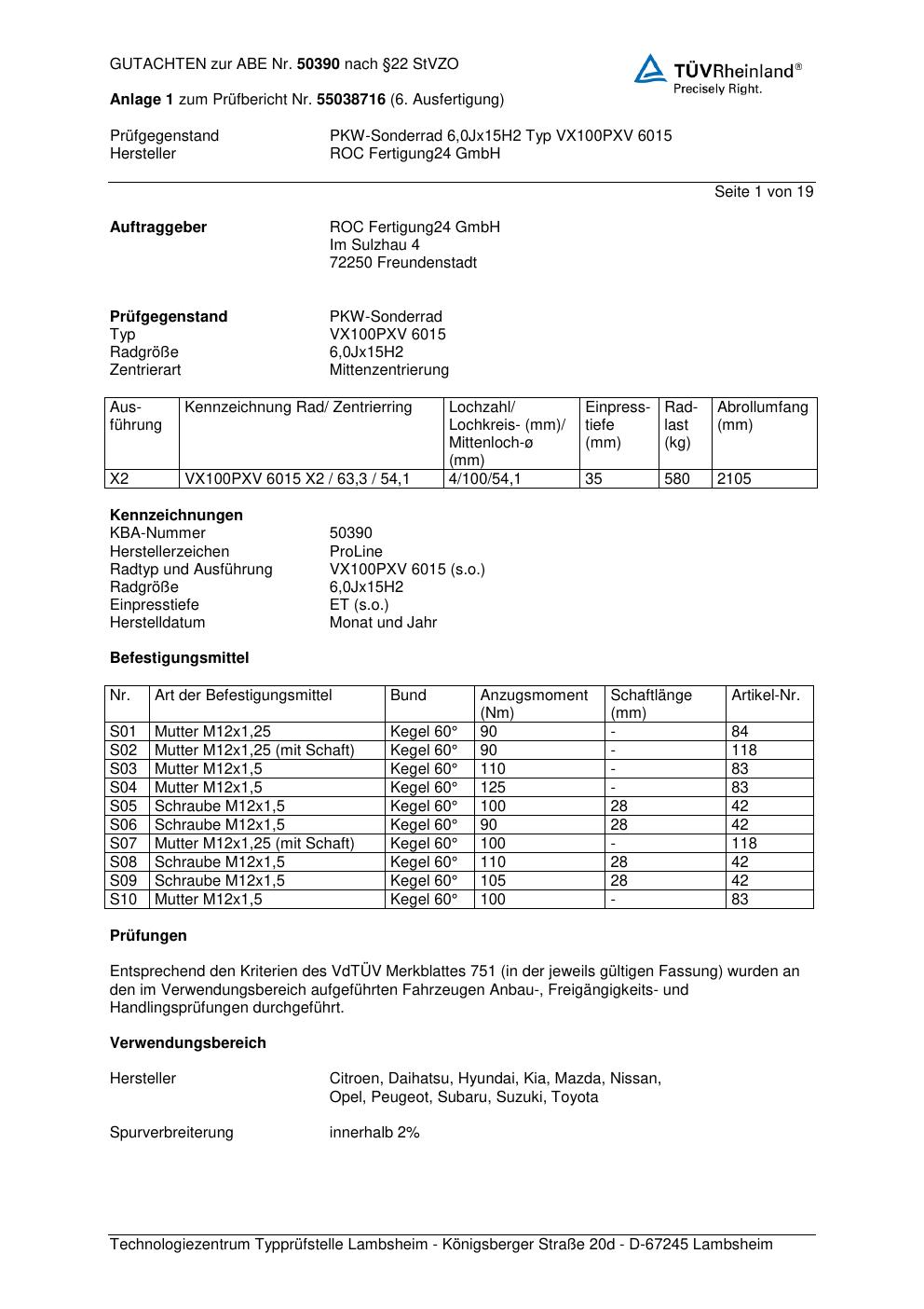 Felgengutachten / ABE für Alufelgen Proline PXV (6Jx15 ET 0, Mittenloch 0 mm) mit KBA 50390 (Zertifikatsnummer KBA 50390). Hier kostenlos als PDF herunterladen. Der Download-Link ist 24 Stunden gültig und kann bis zu zwei Mal verwendet werden.
