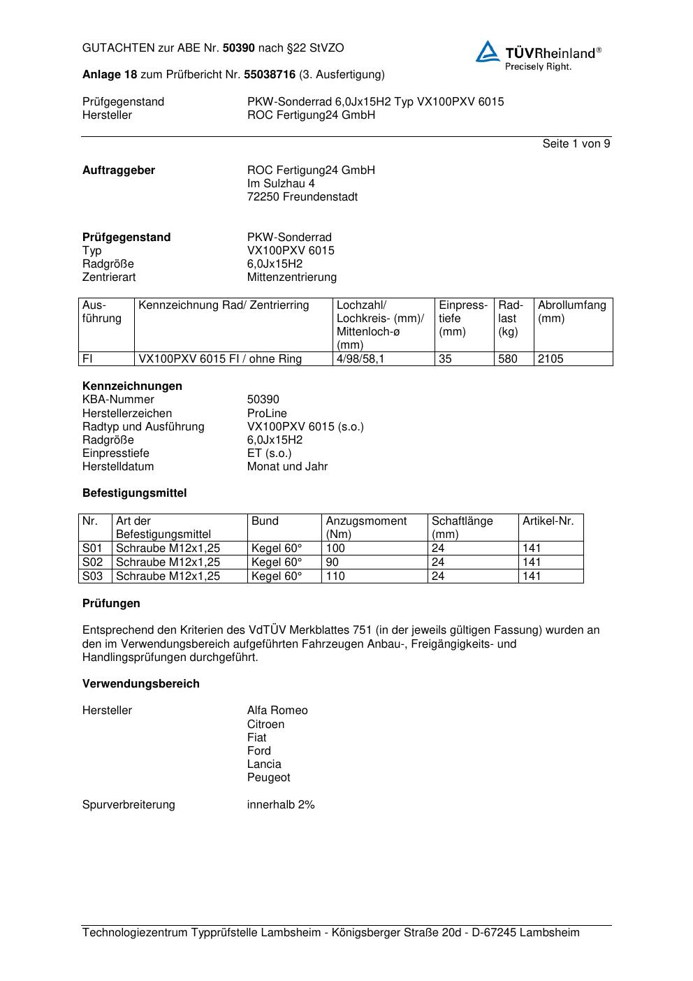 Felgengutachten / ABE für Alufelgen Proline PXV (6Jx15 ET 0, Mittenloch 0 mm) mit KBA 50390 (Zertifikatsnummer KBA 50390). Hier kostenlos als PDF herunterladen. Der Download-Link ist 24 Stunden gültig und kann bis zu zwei Mal verwendet werden.