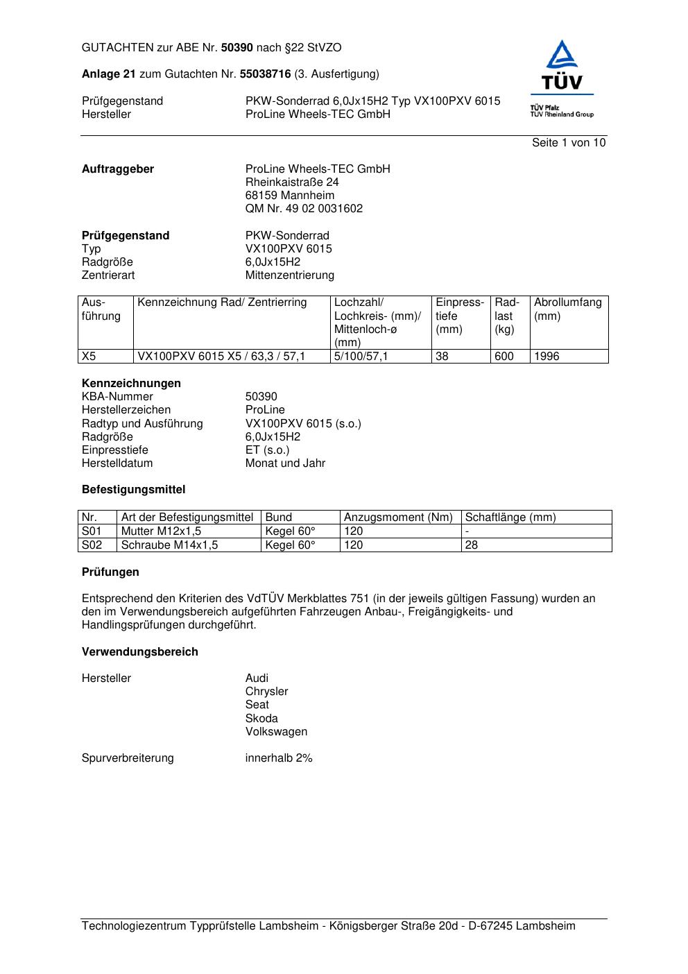Felgengutachten / ABE für Alufelgen Proline PXV (6Jx15 ET 0, Mittenloch 0 mm) mit KBA 50390 (Zertifikatsnummer KBA 50390). Hier kostenlos als PDF herunterladen. Der Download-Link ist 24 Stunden gültig und kann bis zu zwei Mal verwendet werden.
