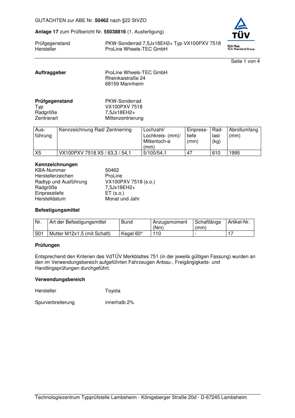 Dieses Gutachten (ABE) bezieht sich auf die Alufelge Proline PXV in der Ausführung 7.5Jx18 ET 0, Mittenloch 0 mm (KBA 50462). Im PDF findest du typischerweise zulässige Reifengrößen, Auflagen/Anbauhinweise und – je nach Dokument – Hinweise zur Eintragung.