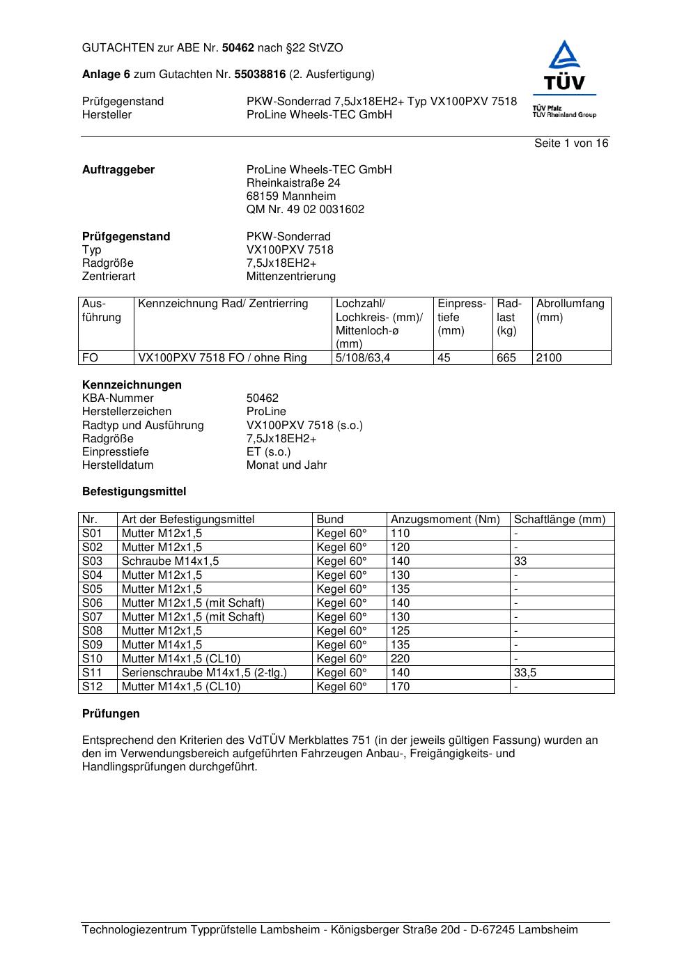 Felgengutachten / ABE für Alufelgen Proline PXV (7.5Jx18 ET 0, Mittenloch 0 mm) mit KBA 50462 (Zertifikatsnummer KBA 50462). Hier kostenlos als PDF herunterladen. Der Download-Link ist 24 Stunden gültig und kann bis zu zwei Mal verwendet werden.