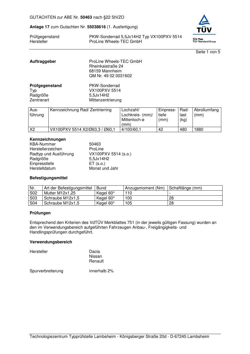 Dieses Gutachten (ABE) bezieht sich auf die Alufelge Proline PXV in der Ausführung 5.5Jx14 ET 0, Mittenloch 0 mm (KBA 50463). Im PDF findest du typischerweise zulässige Reifengrößen, Auflagen/Anbauhinweise und – je nach Dokument – Hinweise zur Eintragung.