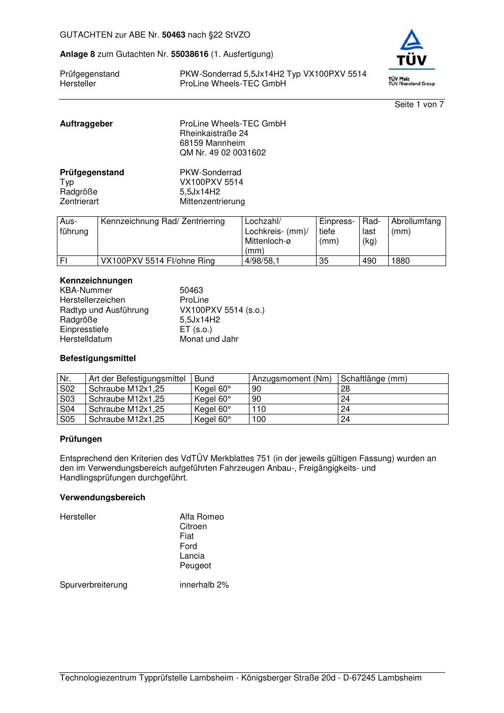 Dieses Gutachten (ABE) bezieht sich auf die Alufelge Proline PXV in der Ausführung 5.5Jx14 ET 0, Mittenloch 0 mm (KBA 50463). Im PDF findest du typischerweise zulässige Reifengrößen, Auflagen/Anbauhinweise und – je nach Dokument – Hinweise zur Eintragung.