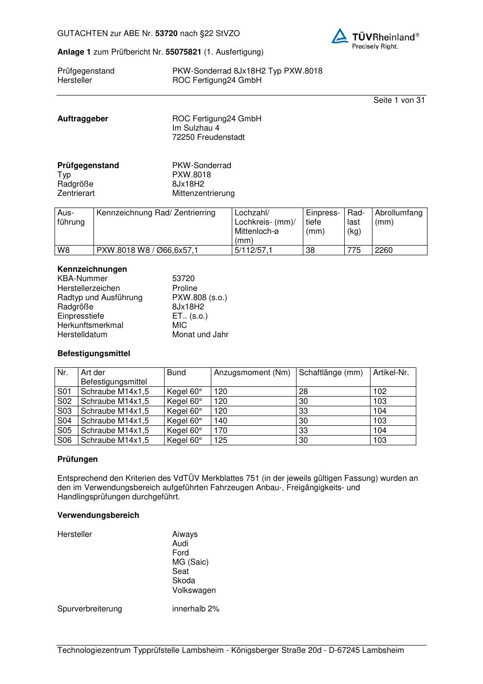 Felgengutachten / ABE für Alufelgen Proline PXW.8018 (8Jx18 ET 0, Mittenloch 0 mm) mit KBA 53720 (Zertifikatsnummer KBA 53720). Hier kostenlos als PDF herunterladen. Der Download-Link ist 24 Stunden gültig und kann bis zu zwei Mal verwendet werden.