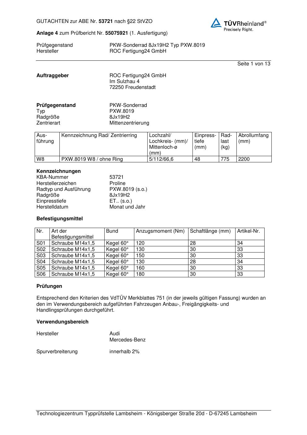 Dieses Gutachten (ABE) bezieht sich auf die Alufelge Proline PXW.8019 in der Ausführung 8Jx19 ET 0, Mittenloch 0 mm (KBA 53721). Im PDF findest du typischerweise zulässige Reifengrößen, Auflagen/Anbauhinweise und – je nach Dokument – Hinweise zur Eintragung.