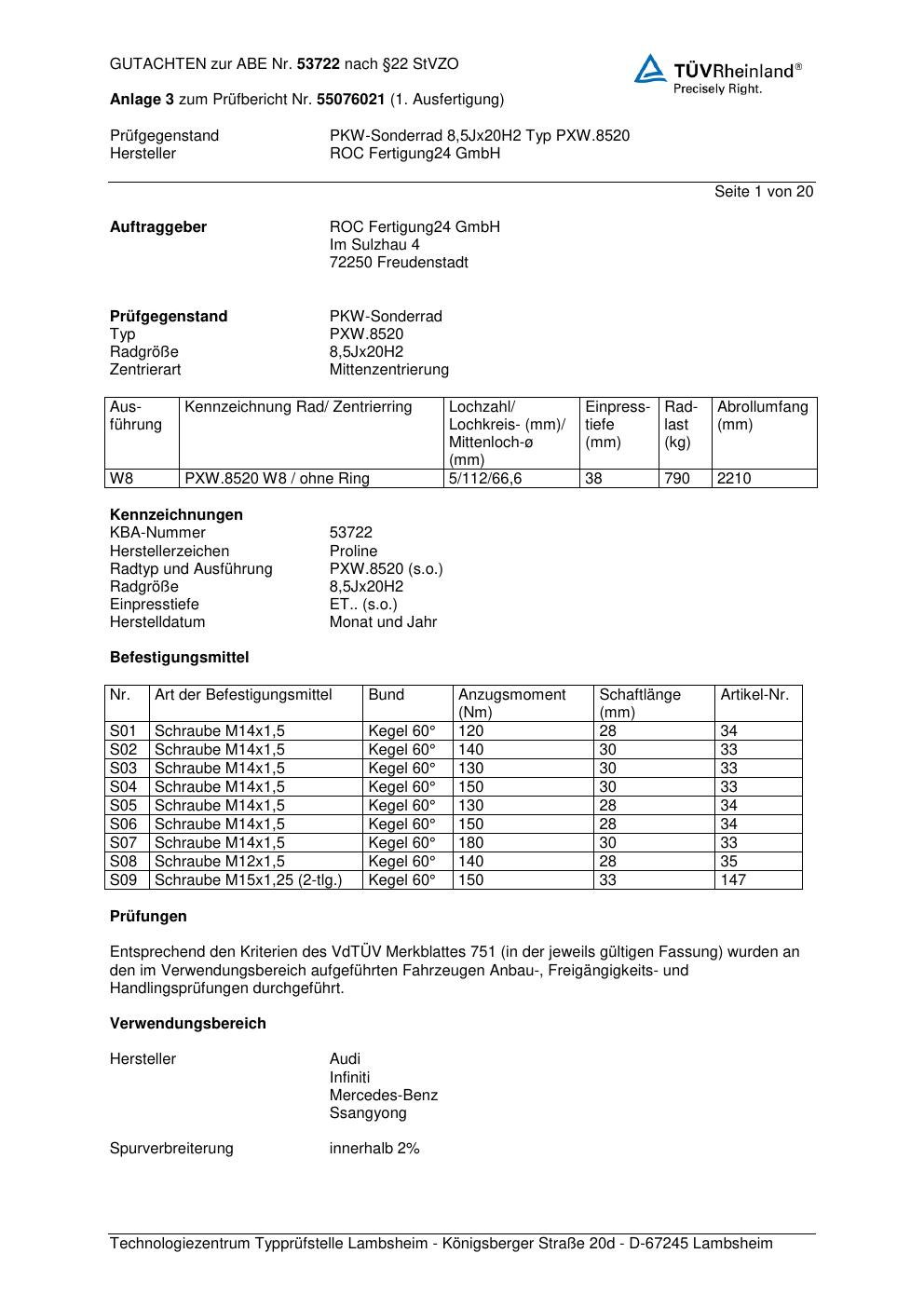 Felgengutachten / ABE für Alufelgen Proline PXW.8520 (8.5Jx2 ET 0, Mittenloch 0 mm) mit KBA 53722 (Zertifikatsnummer KBA 53722). Hier kostenlos als PDF herunterladen. Der Download-Link ist 24 Stunden gültig und kann bis zu zwei Mal verwendet werden.