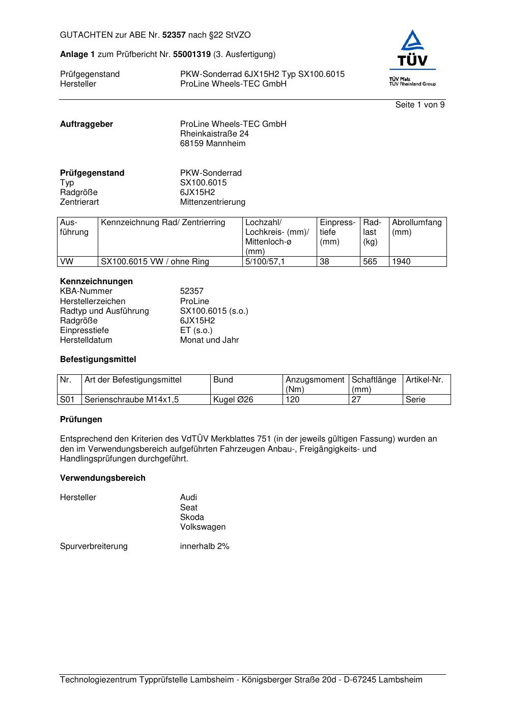 Dieses Gutachten (ABE) bezieht sich auf die Alufelge Proline SX100.6015 in der Ausführung 6Jx15 ET 0, Mittenloch 0 mm (KBA 52357). Im PDF findest du typischerweise zulässige Reifengrößen, Auflagen/Anbauhinweise und – je nach Dokument – Hinweise zur Eintragung.