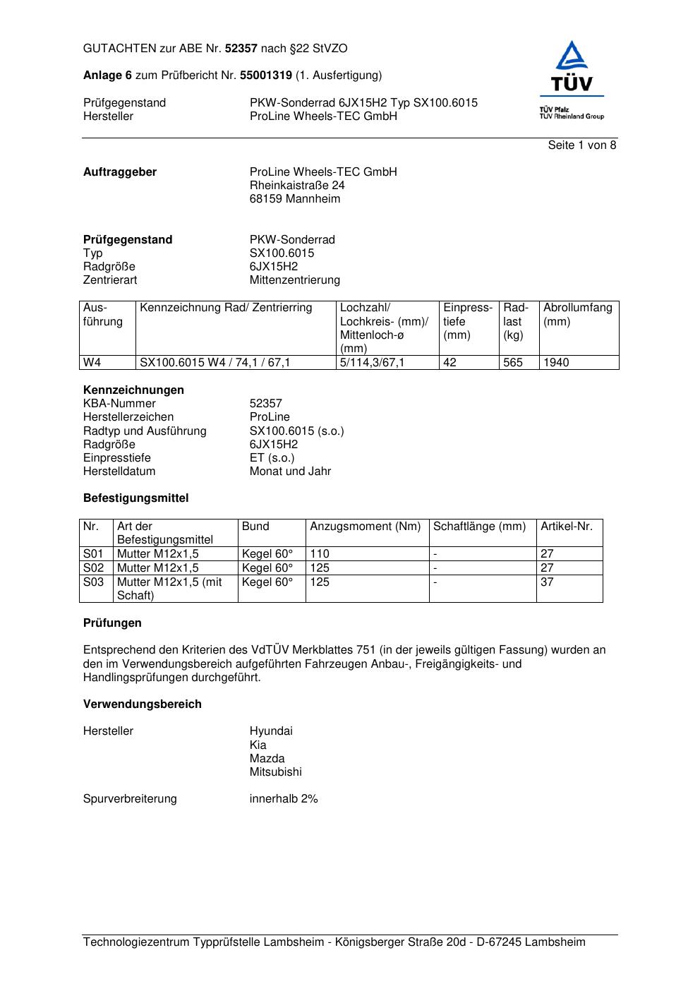 Dieses Gutachten (ABE) bezieht sich auf die Alufelge Proline SX100.6015 in der Ausführung 6Jx15 ET 0, Mittenloch 0 mm (KBA 52357). Im PDF findest du typischerweise zulässige Reifengrößen, Auflagen/Anbauhinweise und – je nach Dokument – Hinweise zur Eintragung.