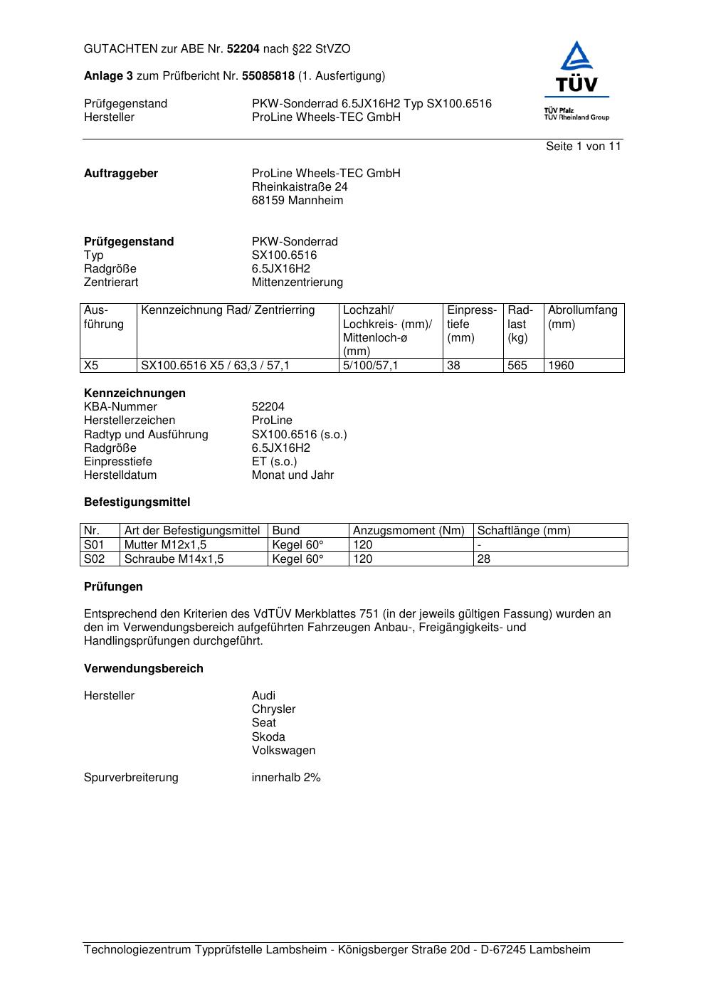 Dieses Gutachten (ABE) bezieht sich auf die Alufelge Proline SX100.6516 in der Ausführung 6.5Jx16 ET 0, Mittenloch 0 mm (KBA 52204). Im PDF findest du typischerweise zulässige Reifengrößen, Auflagen/Anbauhinweise und – je nach Dokument – Hinweise zur Eintragung.
