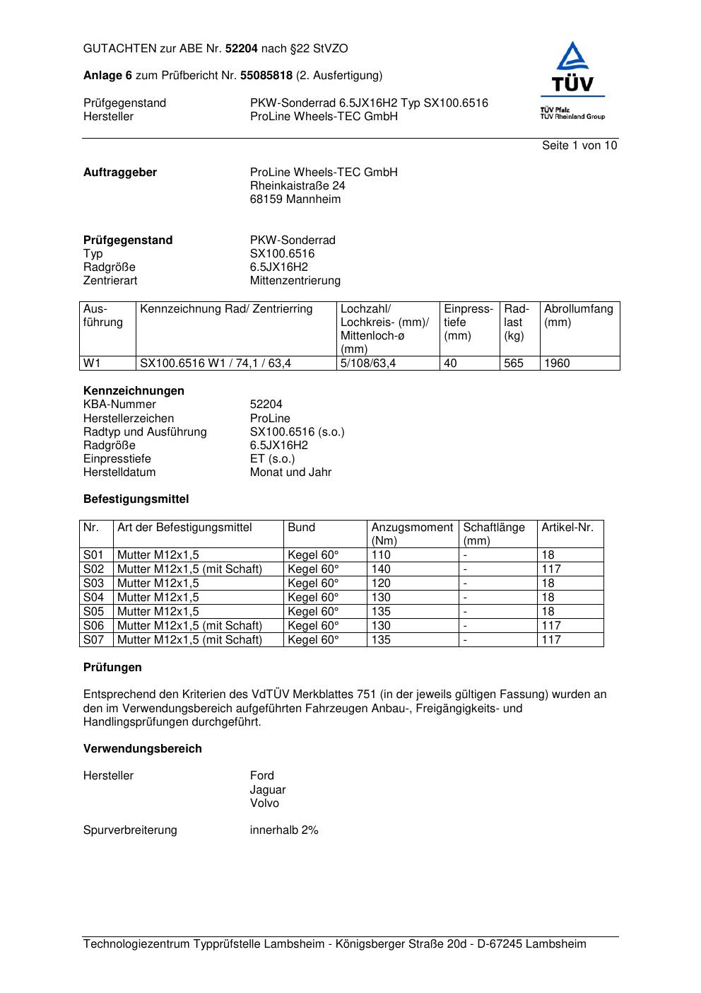 Dieses Gutachten (ABE) bezieht sich auf die Alufelge Proline SX100.6516 in der Ausführung 6.5Jx16 ET 0, Mittenloch 0 mm (KBA 52204). Im PDF findest du typischerweise zulässige Reifengrößen, Auflagen/Anbauhinweise und – je nach Dokument – Hinweise zur Eintragung.