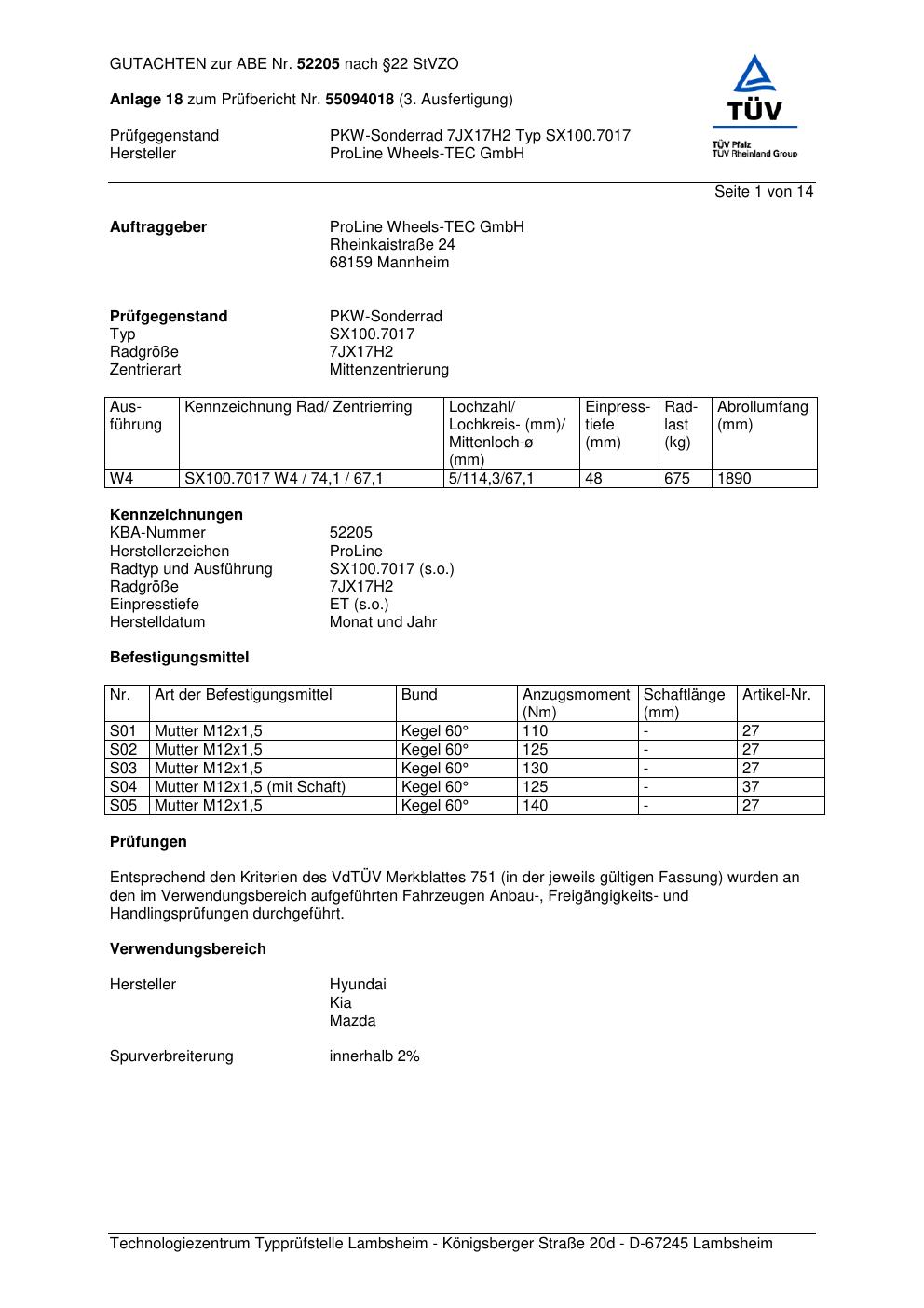 Dieses Gutachten (ABE) bezieht sich auf die Alufelge Proline SX100.7017 in der Ausführung 7Jx17 ET 0, Mittenloch 0 mm (KBA 52205). Im PDF findest du typischerweise zulässige Reifengrößen, Auflagen/Anbauhinweise und – je nach Dokument – Hinweise zur Eintragung.