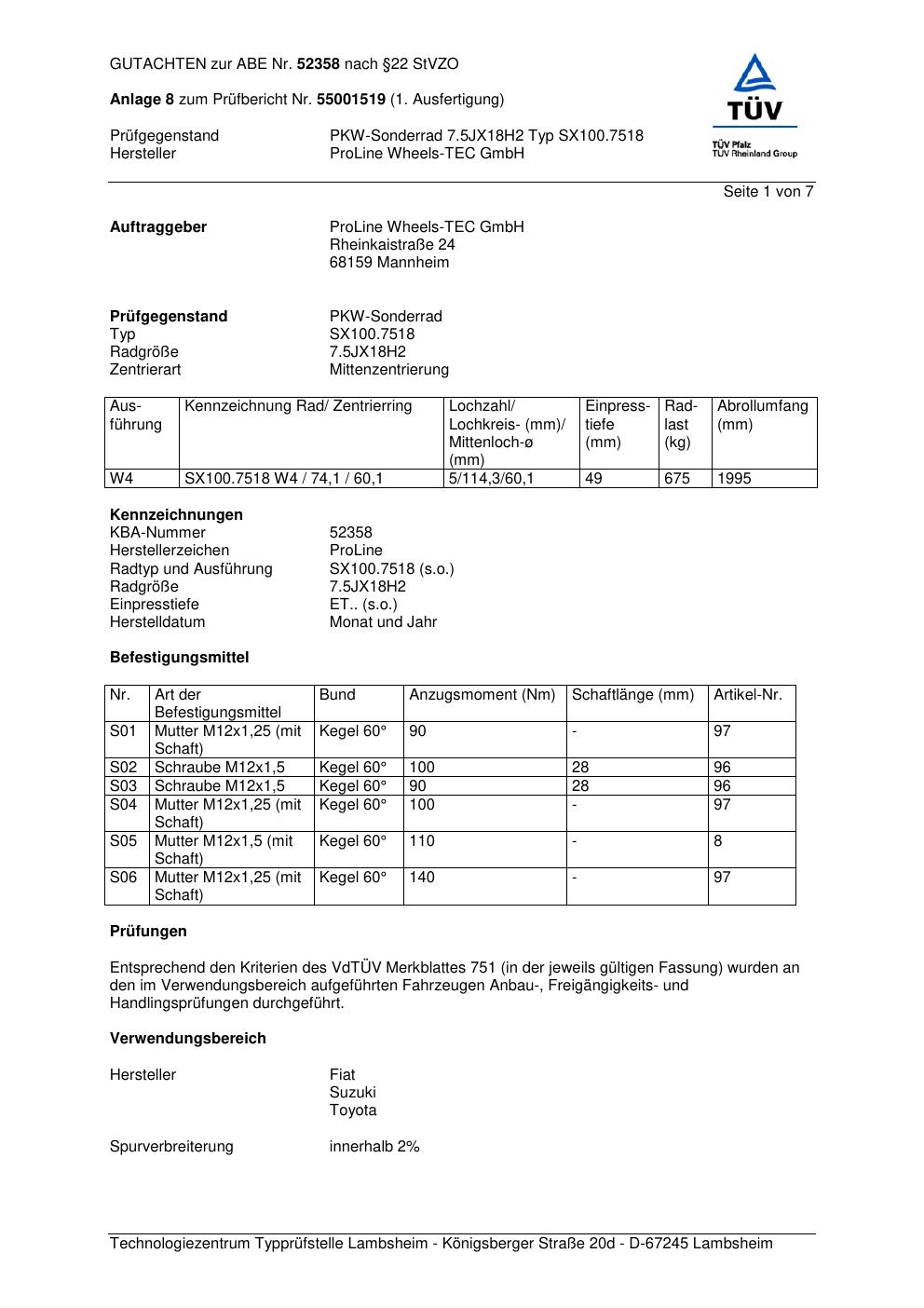 Dieses Gutachten (ABE) bezieht sich auf die Alufelge Proline SX100.7518 in der Ausführung 7.5Jx18 ET 0, Mittenloch 0 mm (KBA 52358). Im PDF findest du typischerweise zulässige Reifengrößen, Auflagen/Anbauhinweise und – je nach Dokument – Hinweise zur Eintragung.