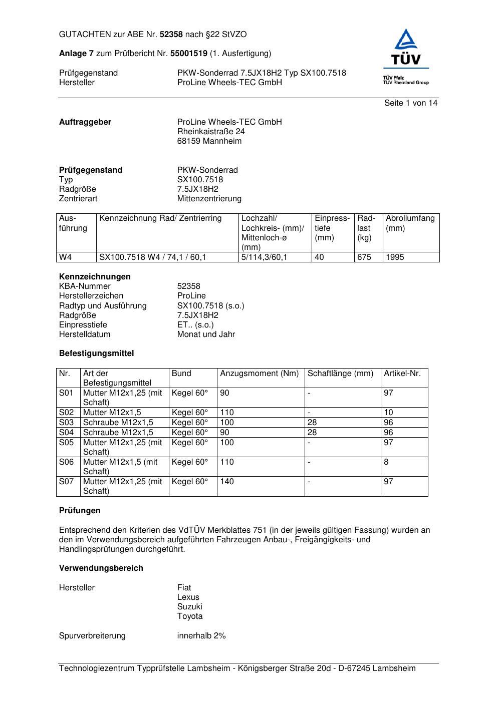 Dieses Gutachten (ABE) bezieht sich auf die Alufelge Proline SX100.7518 in der Ausführung 7.5Jx18 ET 0, Mittenloch 0 mm (KBA 52358). Im PDF findest du typischerweise zulässige Reifengrößen, Auflagen/Anbauhinweise und – je nach Dokument – Hinweise zur Eintragung.