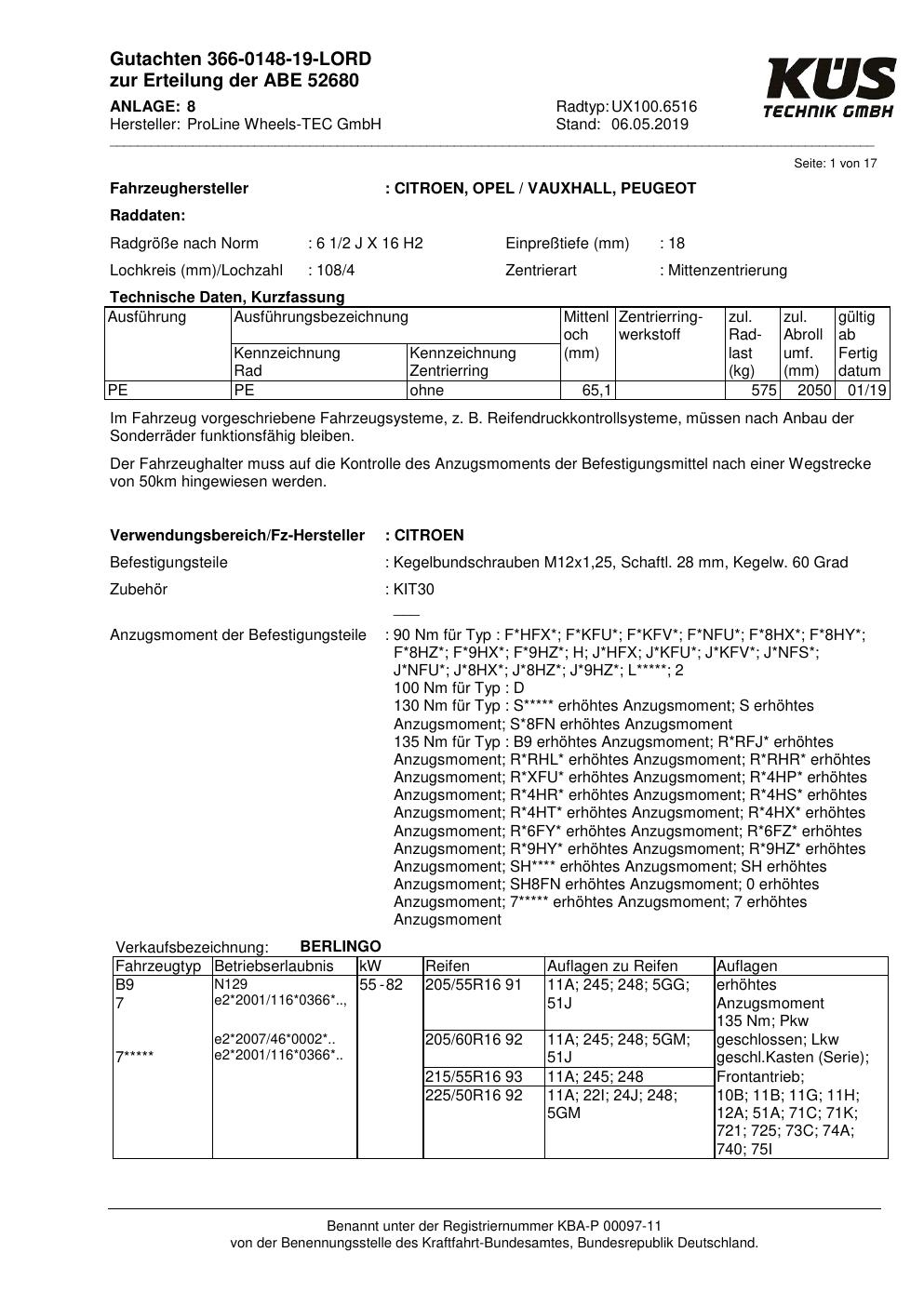 Dieses Gutachten (ABE) bezieht sich auf die Alufelge Proline UX100.6516 in der Ausführung 6.5Jx16 ET 0, Mittenloch 0 mm (KBA 52680). Im PDF findest du typischerweise zulässige Reifengrößen, Auflagen/Anbauhinweise und – je nach Dokument – Hinweise zur Eintragung.