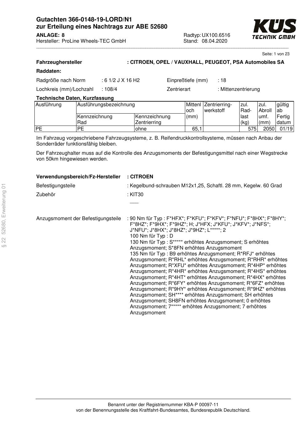 Dieses Gutachten (ABE) bezieht sich auf die Alufelge Proline UX100.6516 in der Ausführung 6.5Jx16 ET 0, Mittenloch 0 mm (KBA 52680). Im PDF findest du typischerweise zulässige Reifengrößen, Auflagen/Anbauhinweise und – je nach Dokument – Hinweise zur Eintragung.