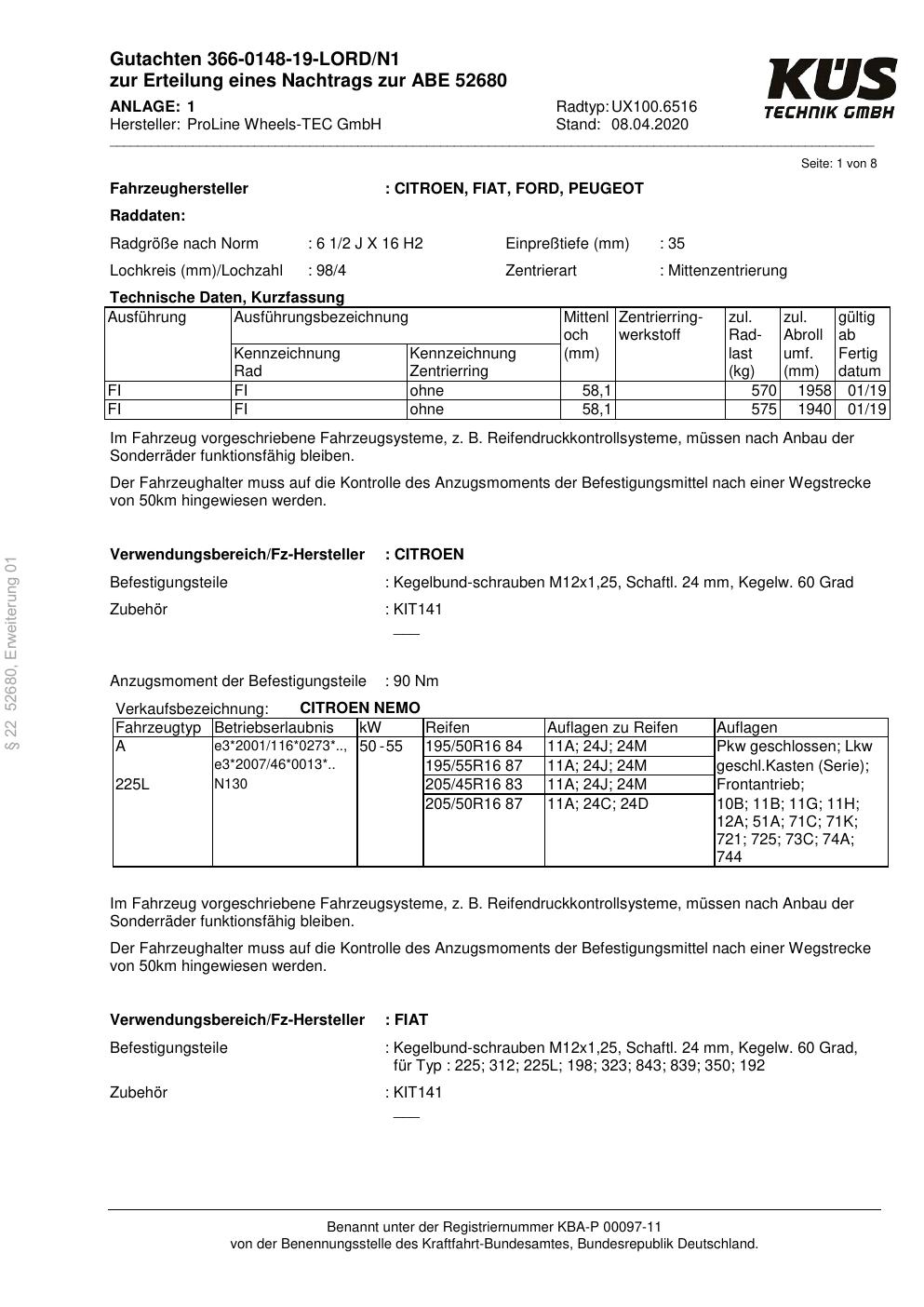 Dieses Gutachten (ABE) bezieht sich auf die Alufelge Proline UX100.6516 in der Ausführung 6.5Jx16 ET 0, Mittenloch 0 mm (KBA 52680). Im PDF findest du typischerweise zulässige Reifengrößen, Auflagen/Anbauhinweise und – je nach Dokument – Hinweise zur Eintragung.
