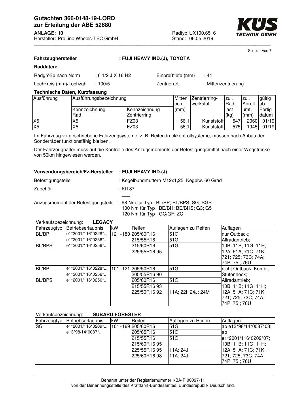 Dieses Gutachten (ABE) bezieht sich auf die Alufelge Proline UX100.6516 in der Ausführung 6.5Jx16 ET 0, Mittenloch 0 mm (KBA 52680). Im PDF findest du typischerweise zulässige Reifengrößen, Auflagen/Anbauhinweise und – je nach Dokument – Hinweise zur Eintragung.
