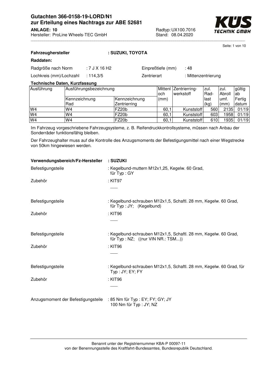 Dieses Gutachten (ABE) bezieht sich auf die Alufelge Proline UX100.7016 in der Ausführung 7Jx16 ET 0, Mittenloch 0 mm (KBA 52681). Im PDF findest du typischerweise zulässige Reifengrößen, Auflagen/Anbauhinweise und – je nach Dokument – Hinweise zur Eintragung.