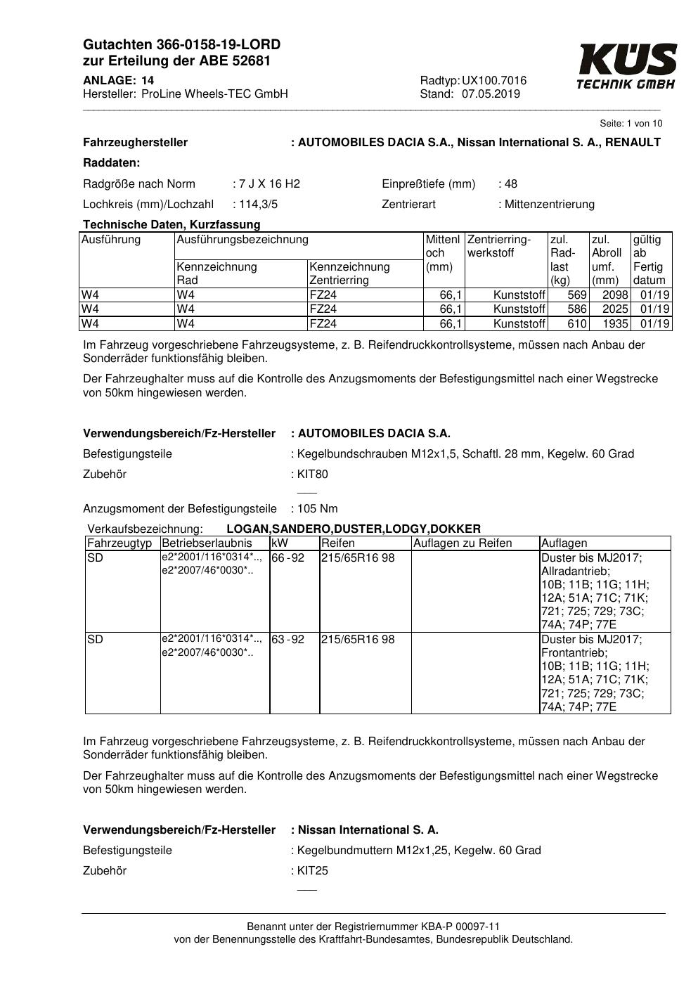 Dieses Gutachten (ABE) bezieht sich auf die Alufelge Proline UX100.7016 in der Ausführung 7Jx16 ET 0, Mittenloch 0 mm (KBA 52681). Im PDF findest du typischerweise zulässige Reifengrößen, Auflagen/Anbauhinweise und – je nach Dokument – Hinweise zur Eintragung.