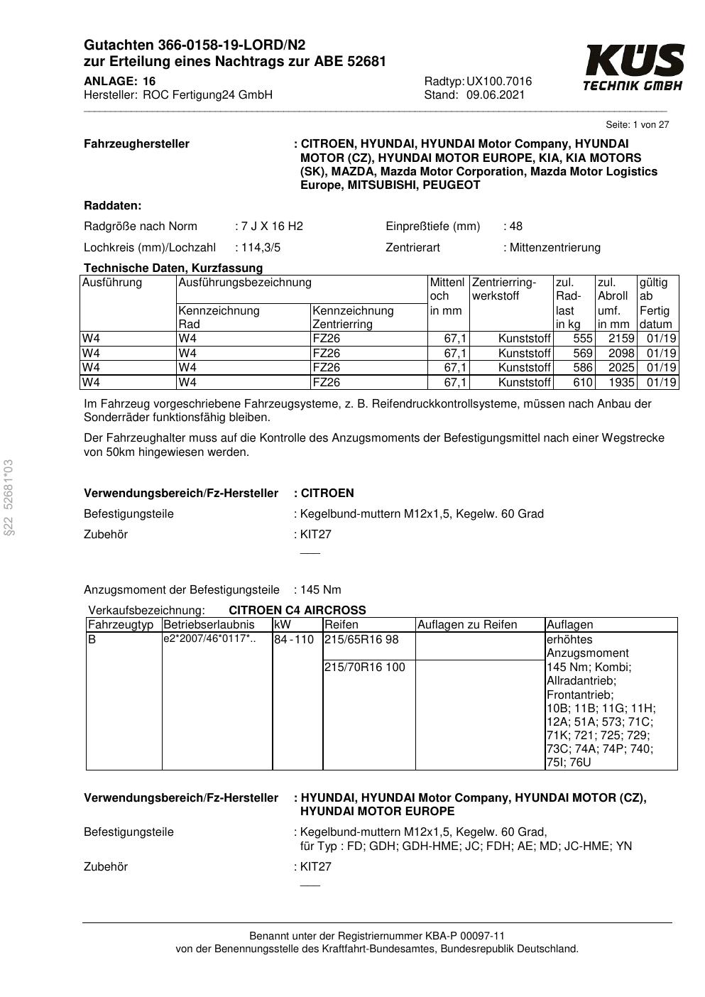 Dieses Gutachten (ABE) bezieht sich auf die Alufelge Proline UX100.7016 in der Ausführung 7Jx16 ET 0, Mittenloch 0 mm (KBA 52681). Im PDF findest du typischerweise zulässige Reifengrößen, Auflagen/Anbauhinweise und – je nach Dokument – Hinweise zur Eintragung.