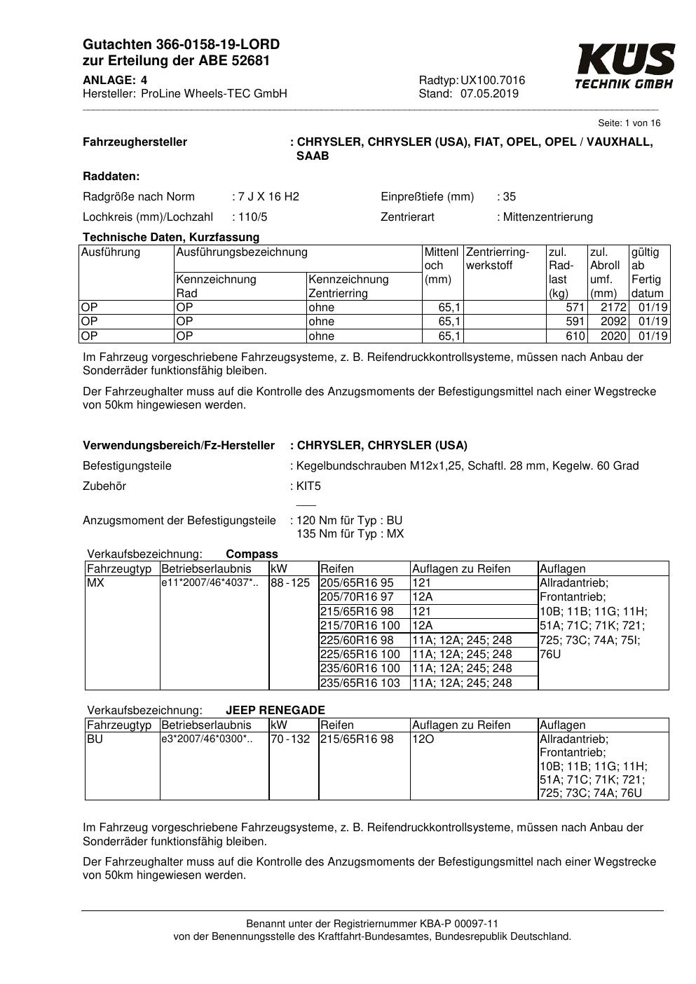 Dieses Gutachten (ABE) bezieht sich auf die Alufelge Proline UX100.7016 in der Ausführung 7Jx16 ET 0, Mittenloch 0 mm (KBA 52681). Im PDF findest du typischerweise zulässige Reifengrößen, Auflagen/Anbauhinweise und – je nach Dokument – Hinweise zur Eintragung.