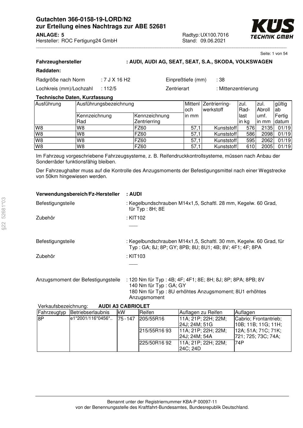 Dieses Gutachten (ABE) bezieht sich auf die Alufelge Proline UX100.7016 in der Ausführung 7Jx16 ET 0, Mittenloch 0 mm (KBA 52681). Im PDF findest du typischerweise zulässige Reifengrößen, Auflagen/Anbauhinweise und – je nach Dokument – Hinweise zur Eintragung.