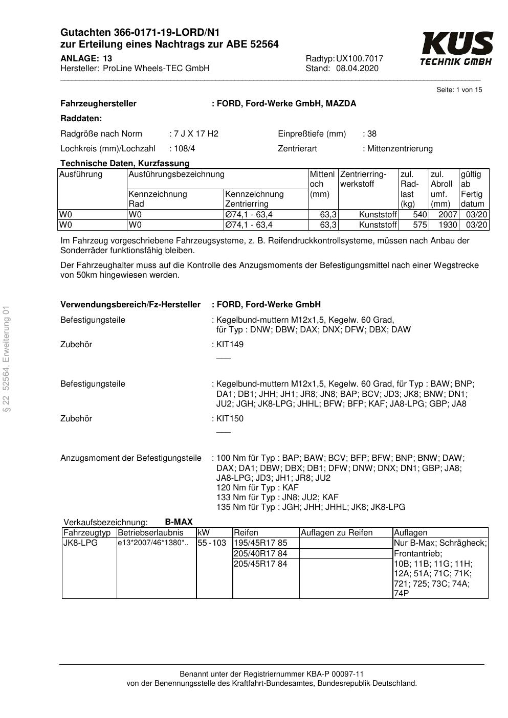 Dieses Gutachten (ABE) bezieht sich auf die Alufelge Proline UX100.7017 in der Ausführung 7Jx17 ET 0, Mittenloch 0 mm (KBA 52564). Im PDF findest du typischerweise zulässige Reifengrößen, Auflagen/Anbauhinweise und – je nach Dokument – Hinweise zur Eintragung.