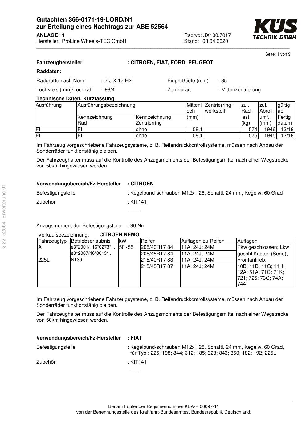 Dieses Gutachten (ABE) bezieht sich auf die Alufelge Proline UX100.7017 in der Ausführung 7Jx17 ET 0, Mittenloch 0 mm (KBA 52564). Im PDF findest du typischerweise zulässige Reifengrößen, Auflagen/Anbauhinweise und – je nach Dokument – Hinweise zur Eintragung.