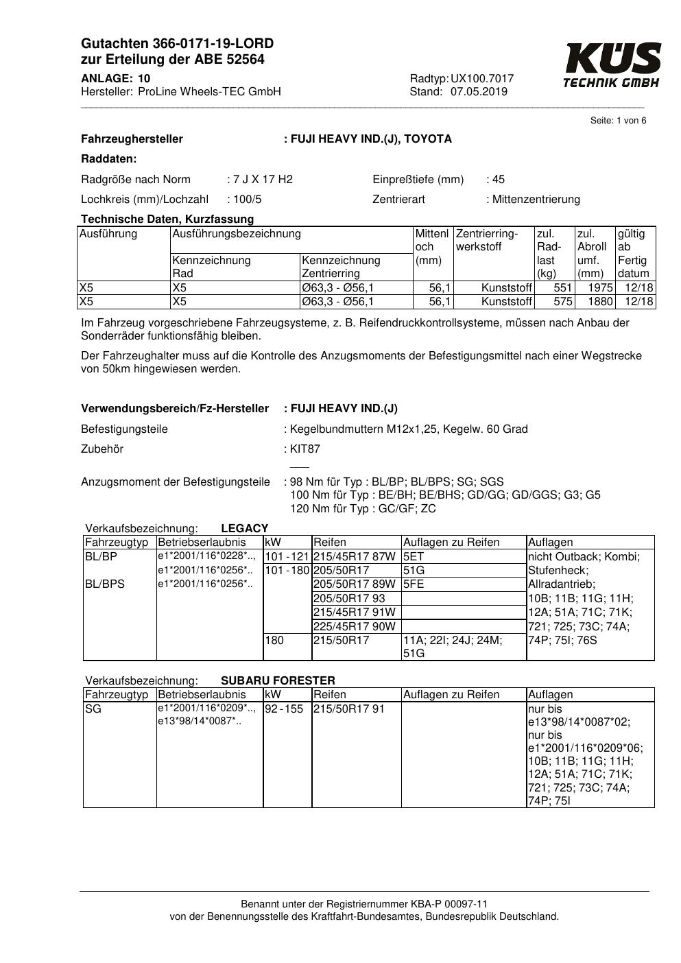 Felgengutachten / ABE für Alufelgen Proline UX100.7017 (7Jx17 ET 0, Mittenloch 0 mm) mit KBA 52564 (Zertifikatsnummer KBA 52564). Hier kostenlos als PDF herunterladen. Der Download-Link ist 24 Stunden gültig und kann bis zu zwei Mal verwendet werden.