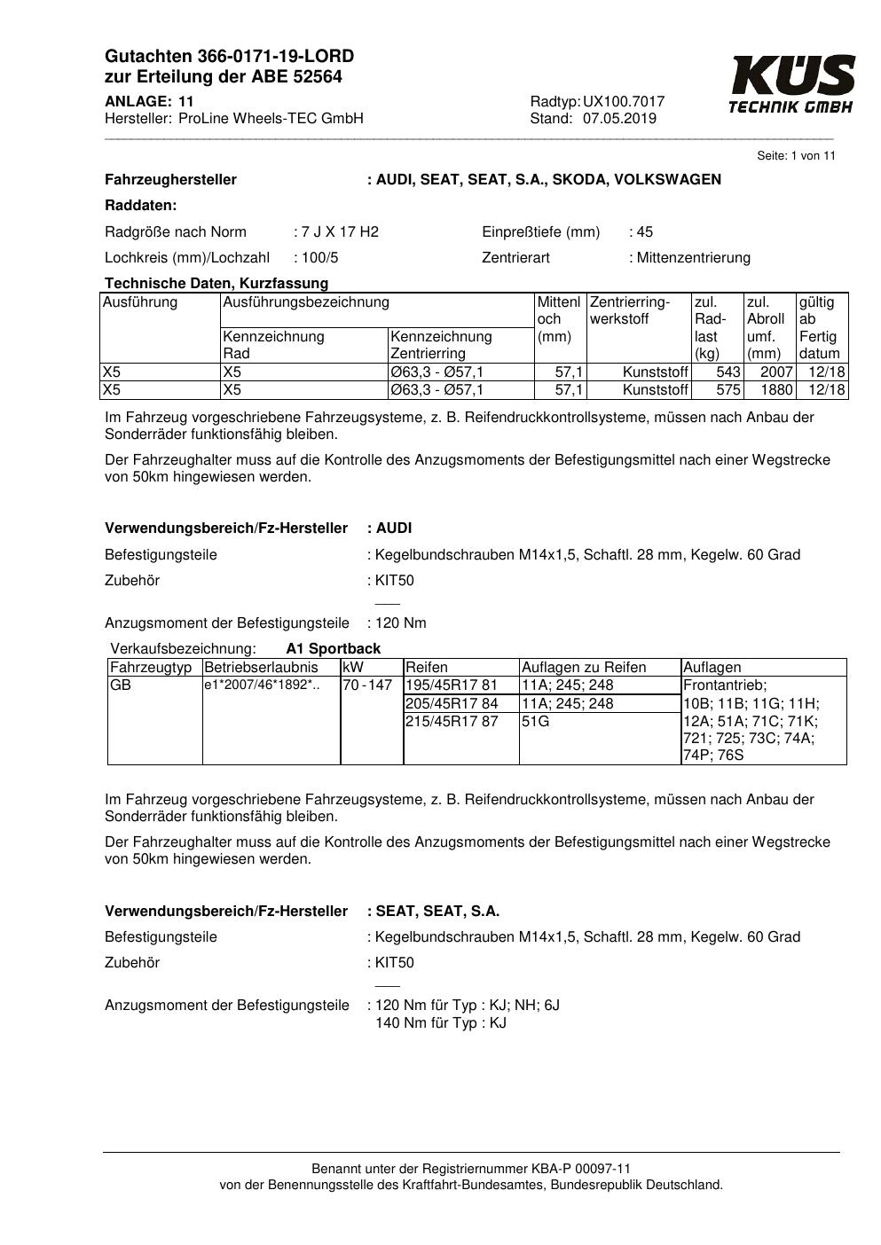 Dieses Gutachten (ABE) bezieht sich auf die Alufelge Proline UX100.7017 in der Ausführung 7Jx17 ET 0, Mittenloch 0 mm (KBA 52564). Im PDF findest du typischerweise zulässige Reifengrößen, Auflagen/Anbauhinweise und – je nach Dokument – Hinweise zur Eintragung.