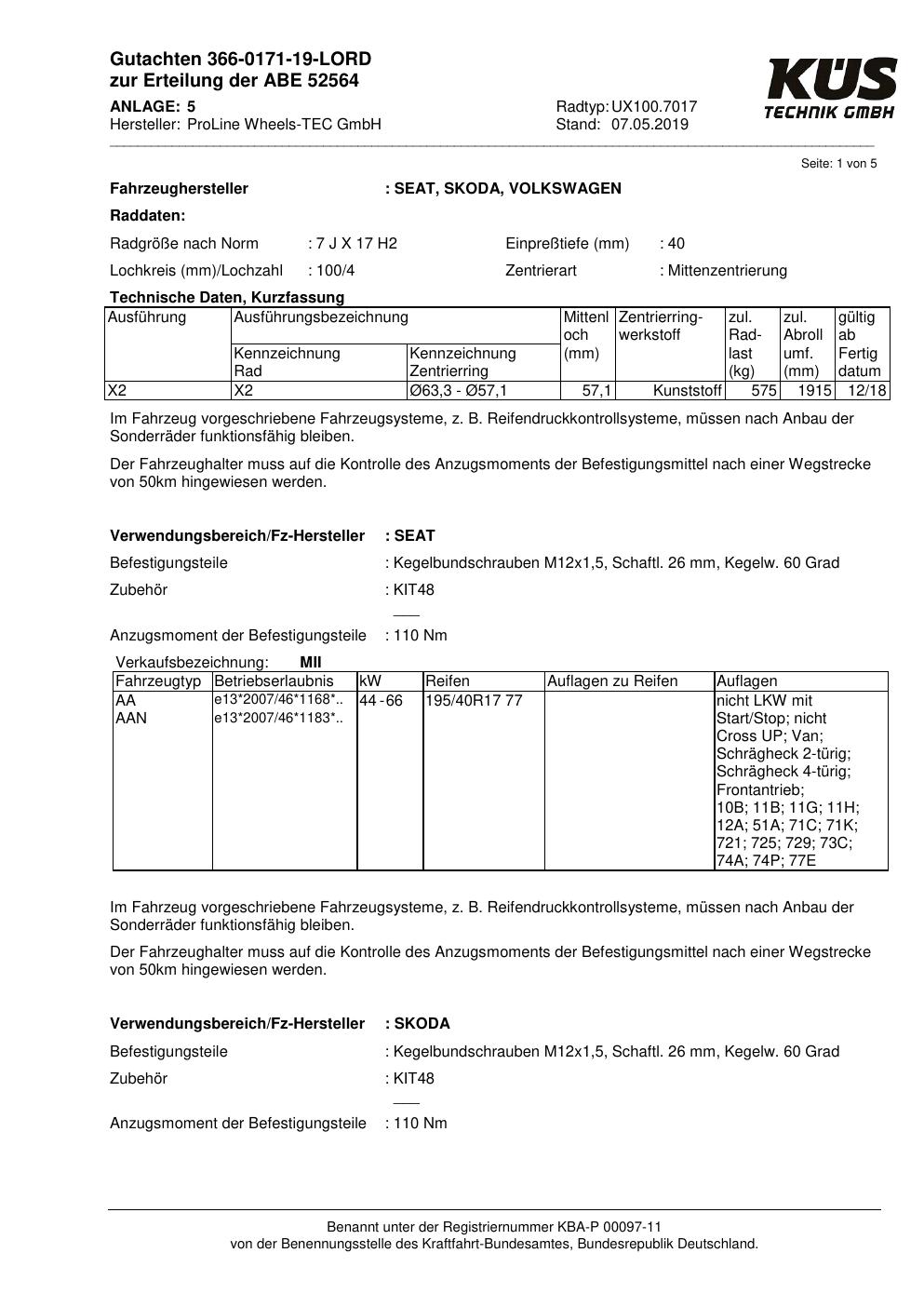 Dieses Gutachten (ABE) bezieht sich auf die Alufelge Proline UX100.7017 in der Ausführung 7Jx17 ET 0, Mittenloch 0 mm (KBA 52564). Im PDF findest du typischerweise zulässige Reifengrößen, Auflagen/Anbauhinweise und – je nach Dokument – Hinweise zur Eintragung.