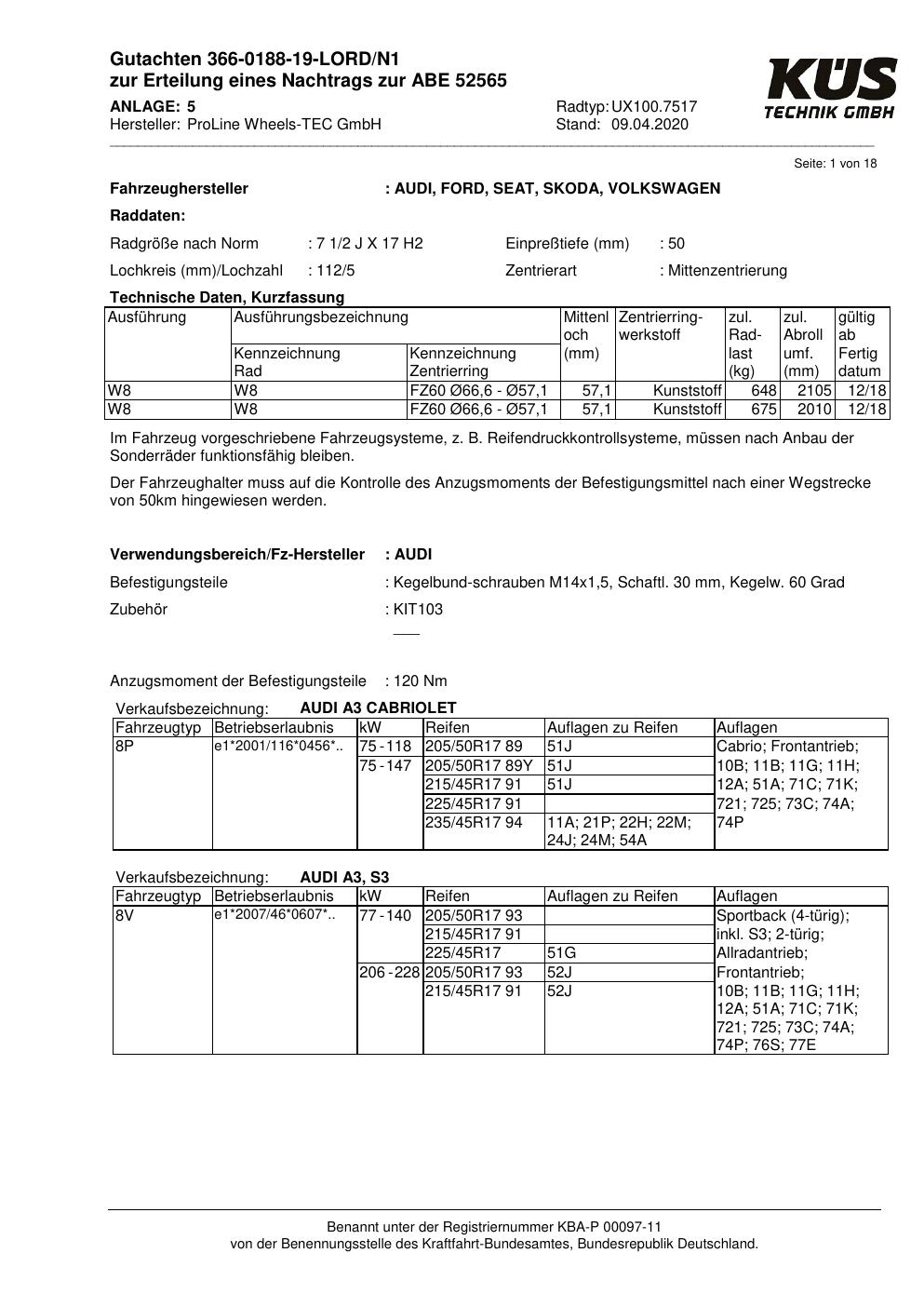Dieses Gutachten (ABE) bezieht sich auf die Alufelge Proline UX100.7517 in der Ausführung 7.5Jx17 ET 0, Mittenloch 0 mm (KBA 52565). Im PDF findest du typischerweise zulässige Reifengrößen, Auflagen/Anbauhinweise und – je nach Dokument – Hinweise zur Eintragung.